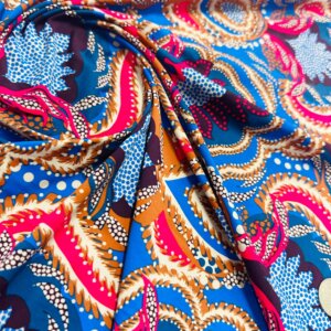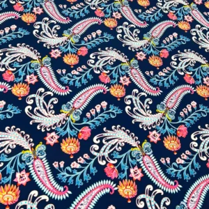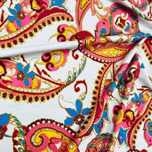 Lycras fabrics with prints of different paisley print colors and shapes, look beautiful in garments such as bathing suits and leggins. Its specific composition is 80% Nylon and 20% Spandex, they are high quality fabrics and thick, all our fabrics are imported from France and the United States.