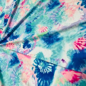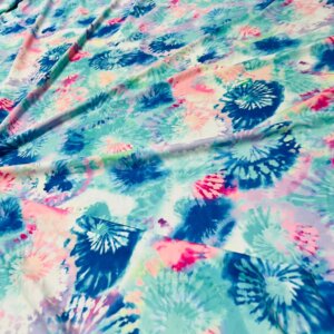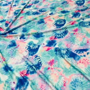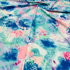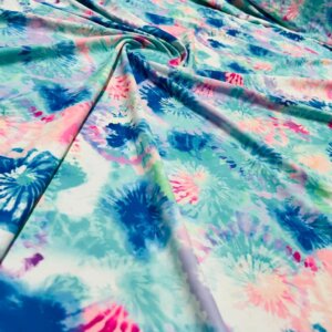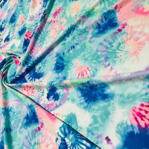 You are viewing Abstract Sky Blue & Pink Tie Dye Print Nylon Spandex Fabric 4 Way Stretch By Yard for swimwear dancewear gymwear sportwear. Extremely beautiful print weight 200 to 220 GSM 80% Nylon 20% Spandex.