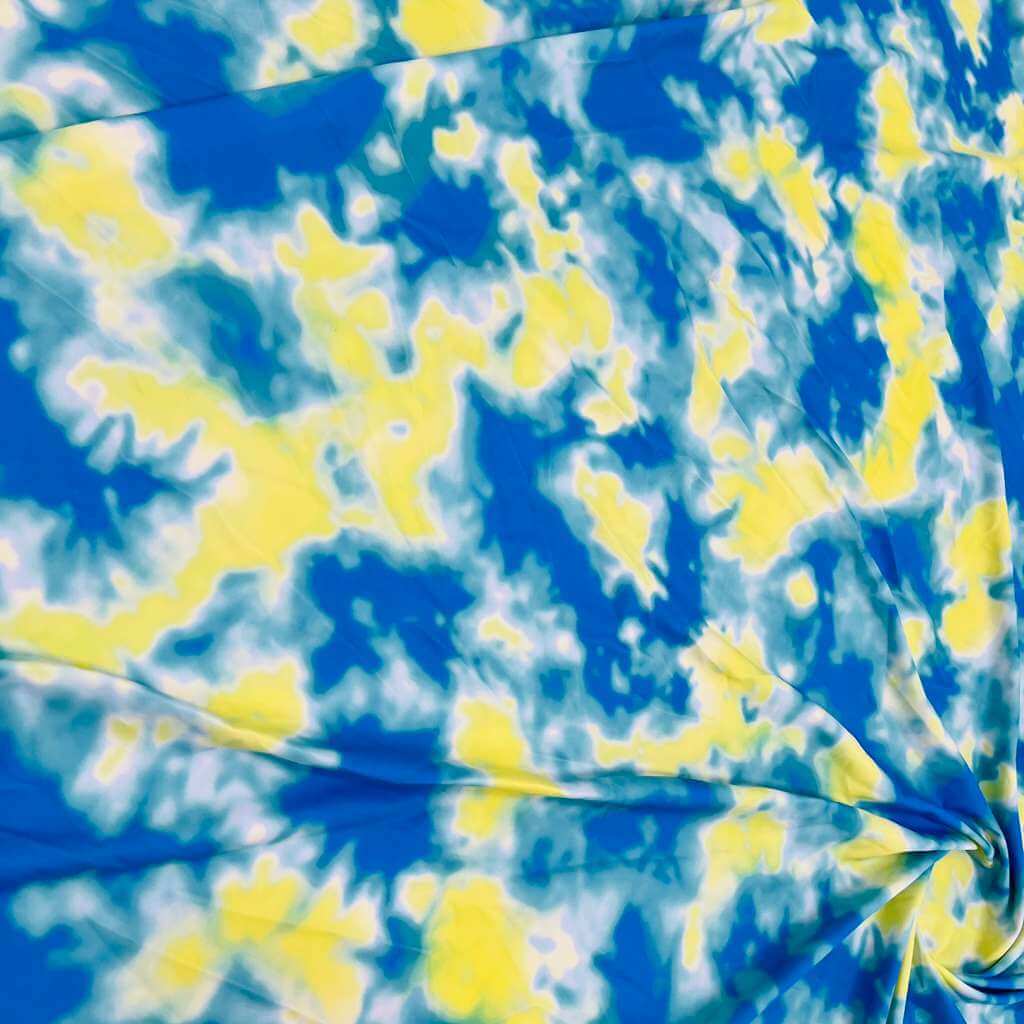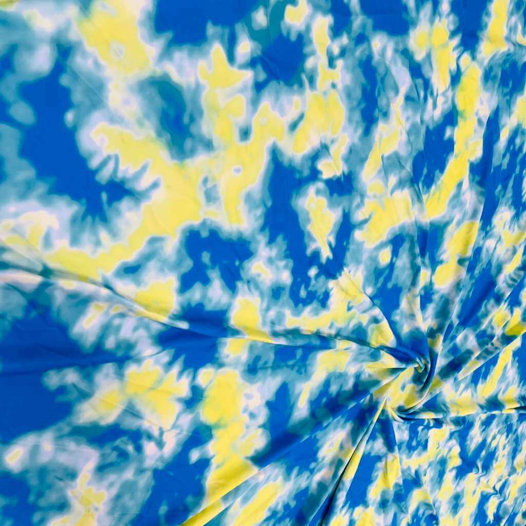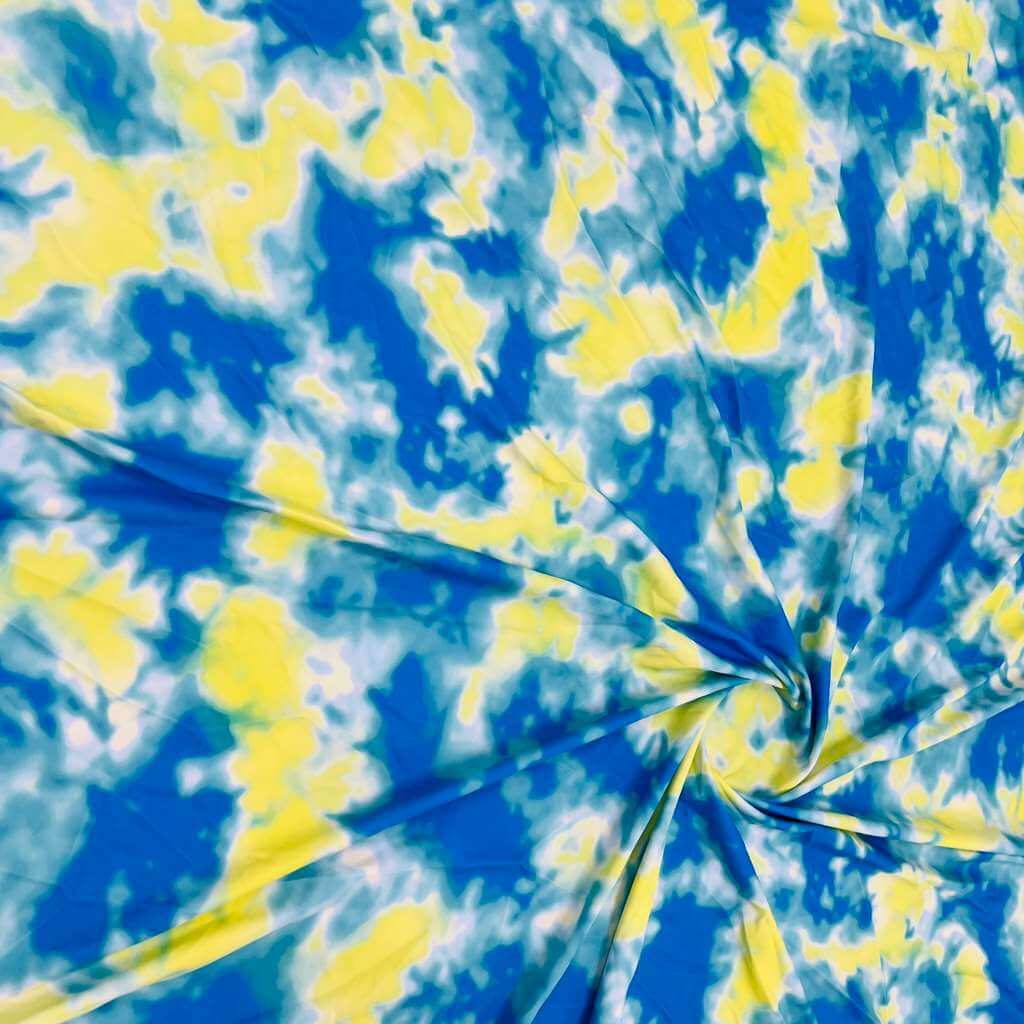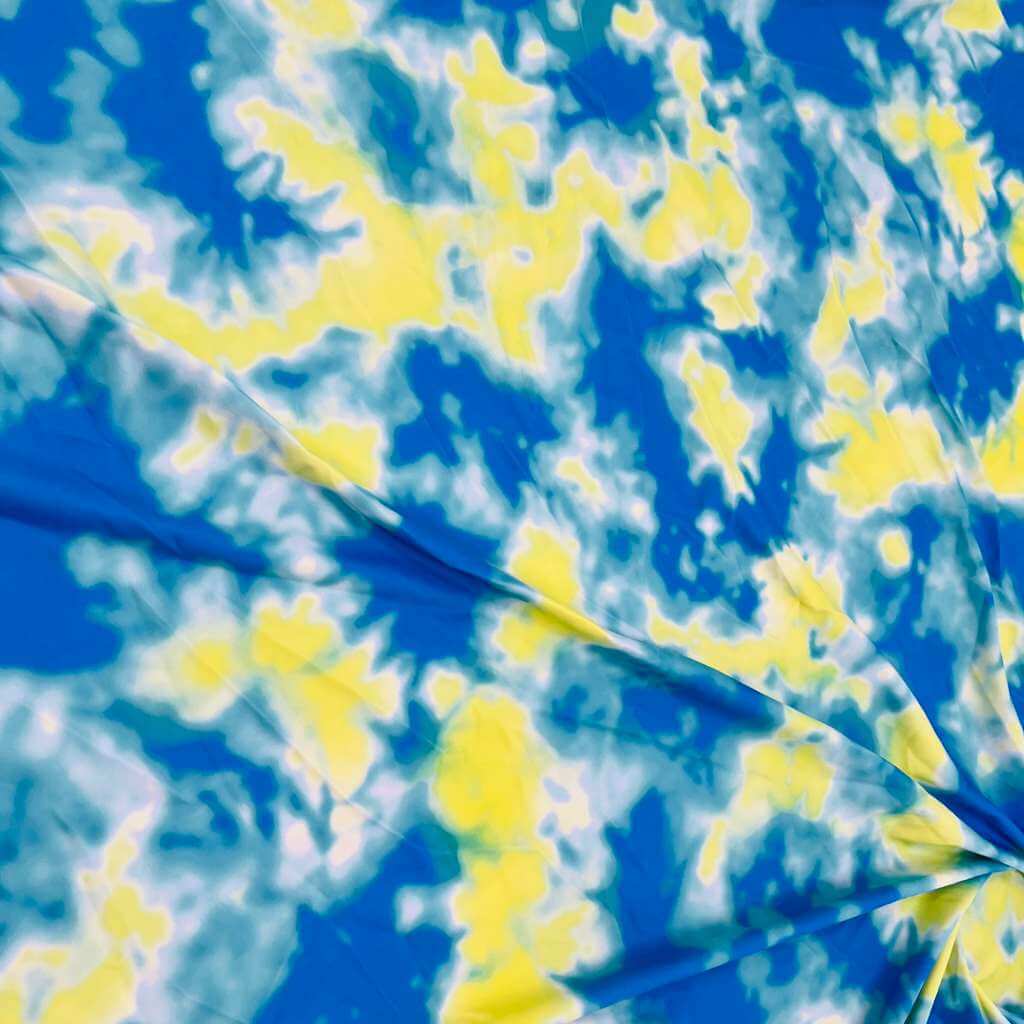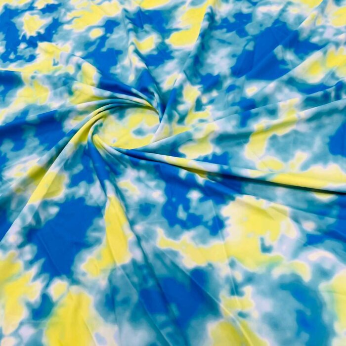 You are viewing Abstract Tie dye Blue and Yellow Printed Nylon Spandex Fabric 4 Way Stretch By Yard for swimwear dancewear gymwear sportwear. Extremely beautiful print weight 200 to 220 GSM 80% Nylon 20% Spandex.
