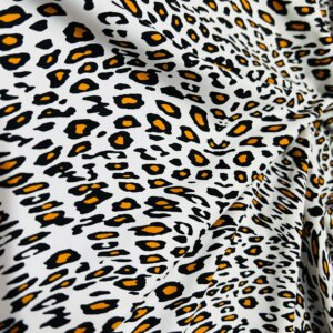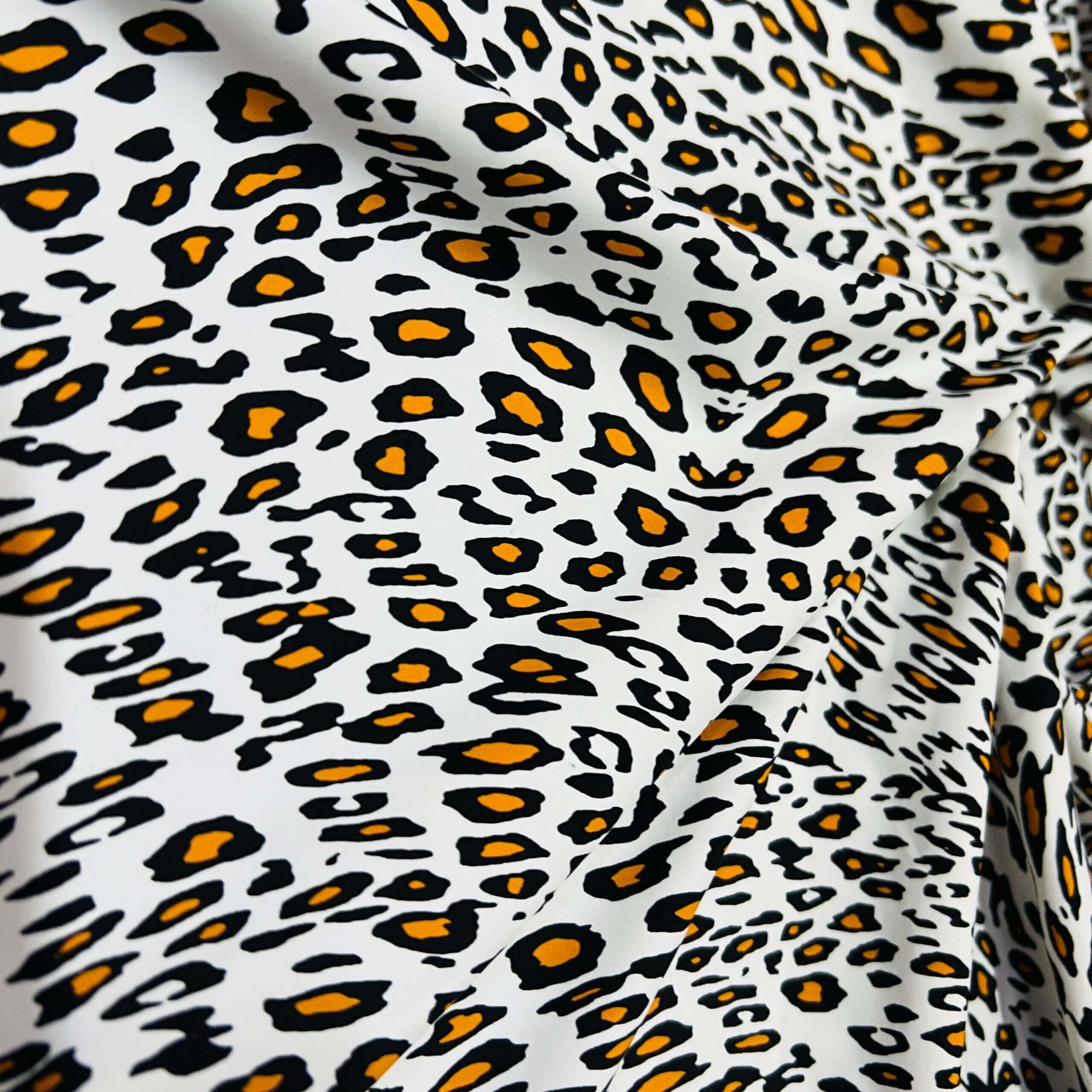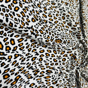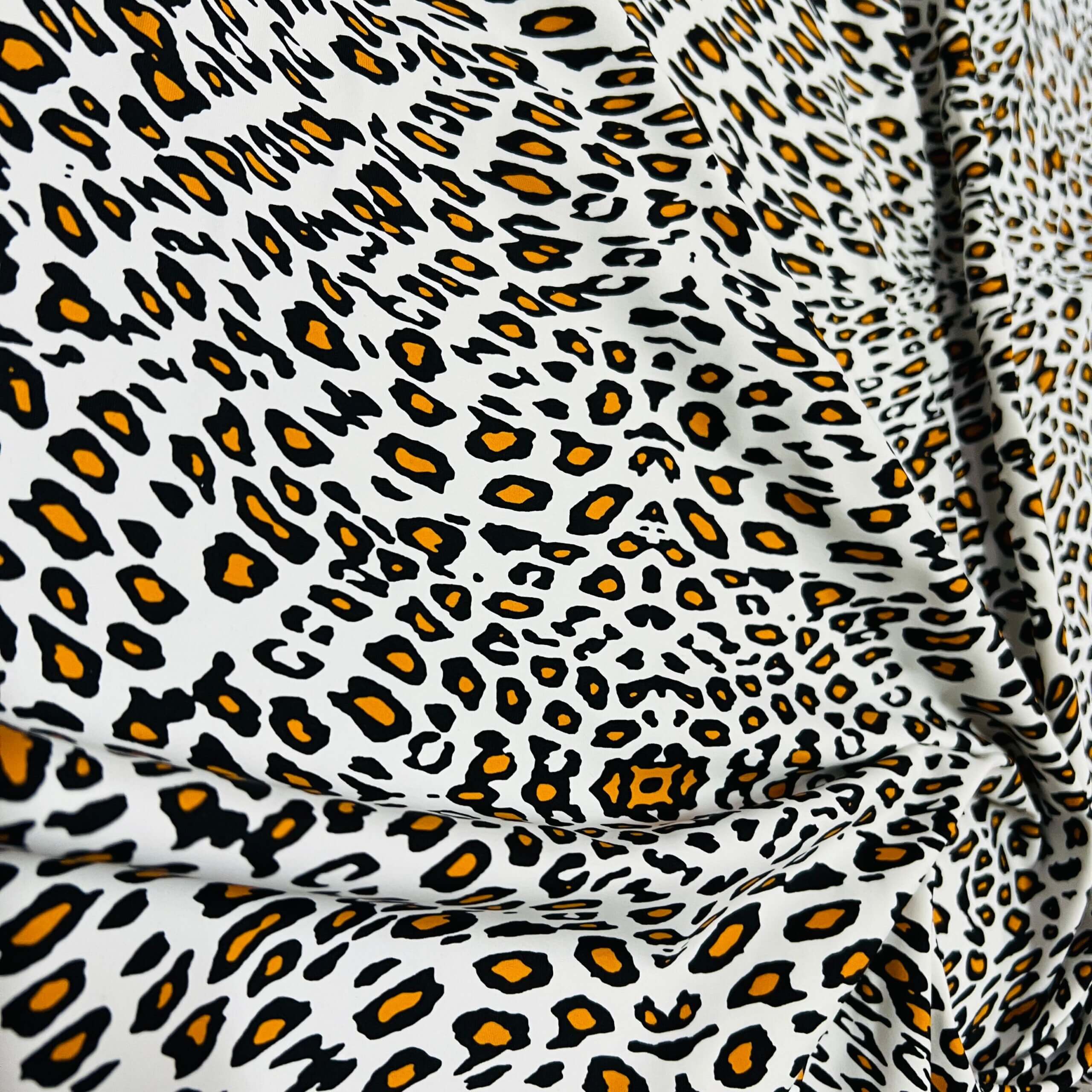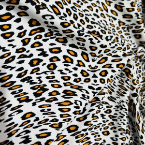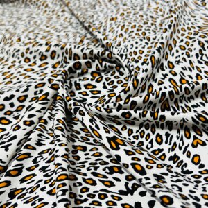 You are viewing Animal Print White and Yellow Nylon Lycra Spandex Fabric 4 Way Stretch By Yard for swimwear dancewear sportwear dress. Extremely beautiful print weight 200 to 220 GSM 80% Nylon 20% Spandex.