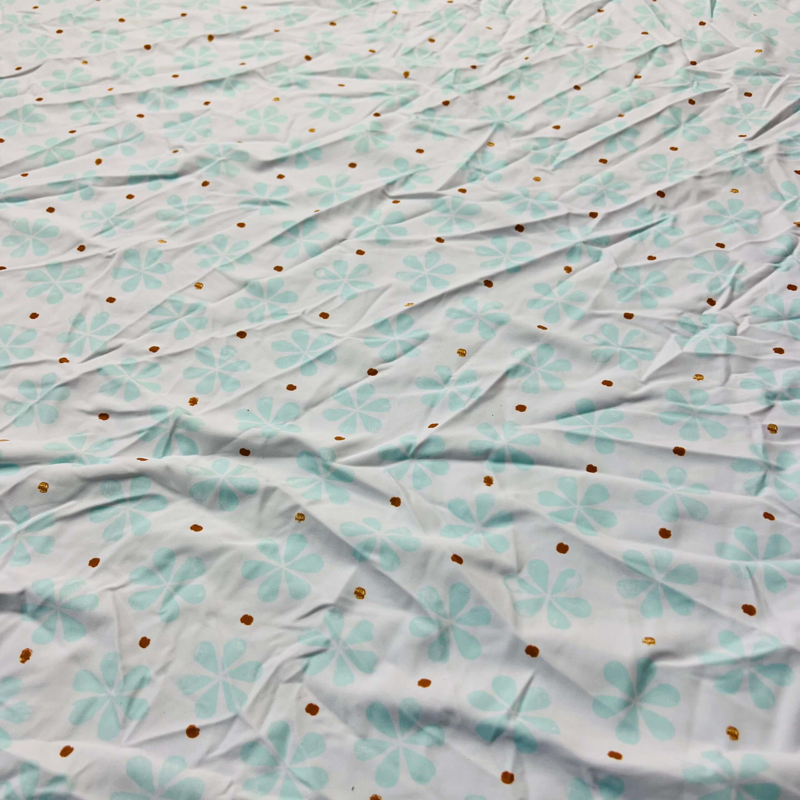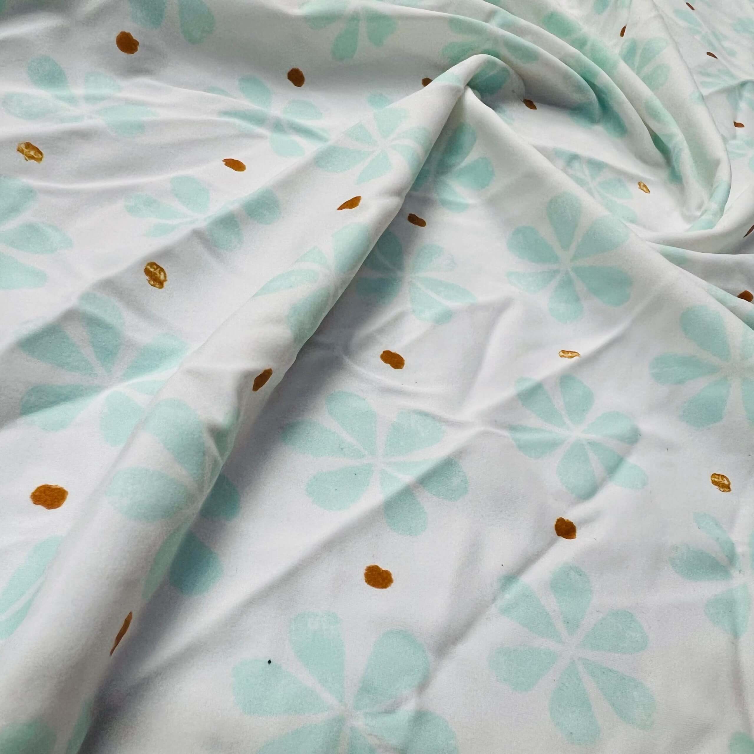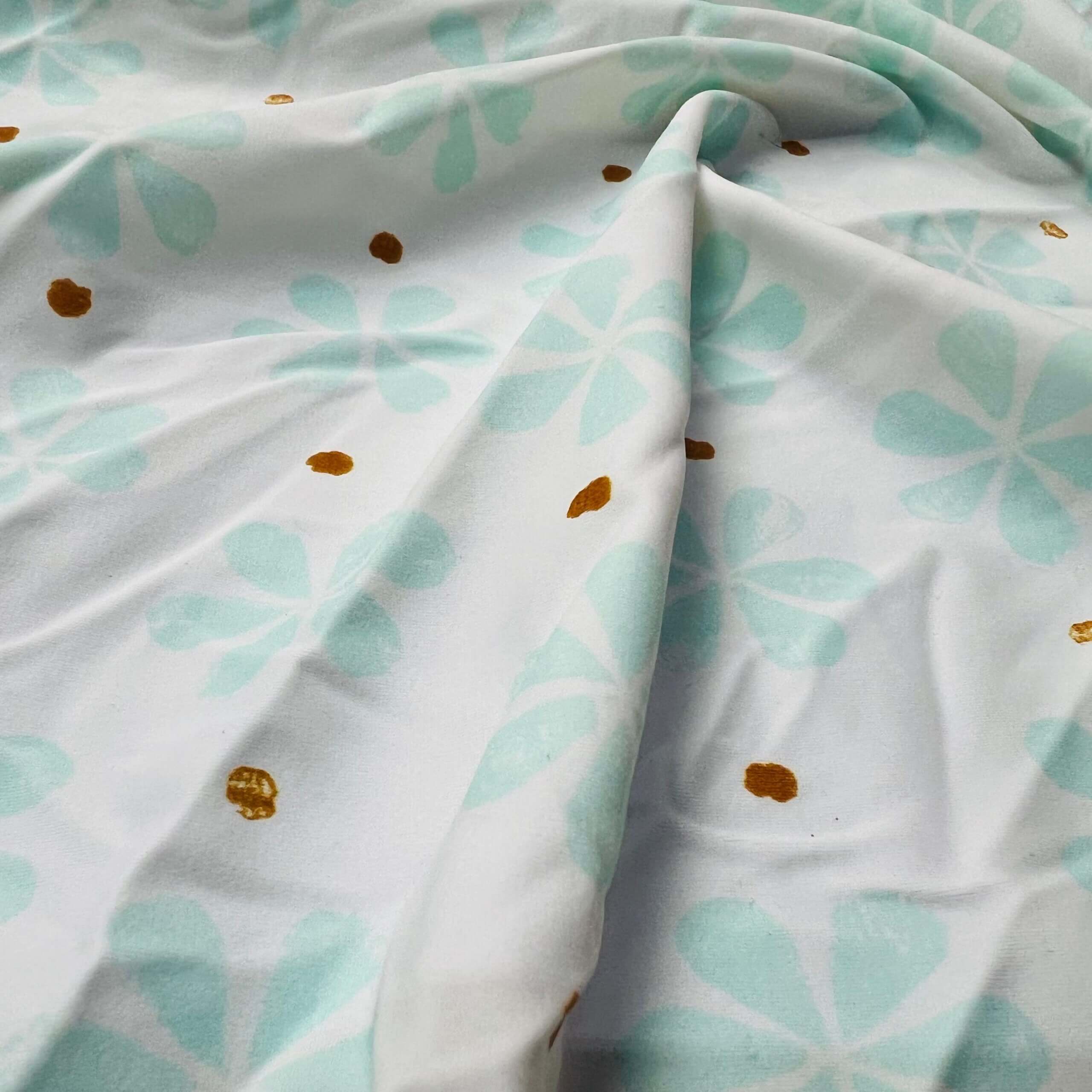 Aquamarine Flowers with Golden Dots White Background Print Nylon Lycra Spandex Fabric 4 Way Stretch By Yard for swimwear dancewear gymwear sportwear dress (203-7)