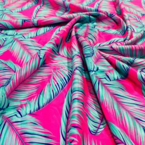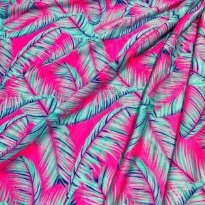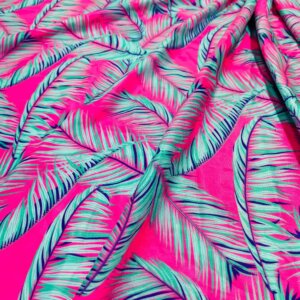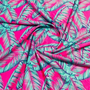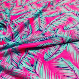 Aquamarine leaves Hot Pink background Print Nylon Lycra Spandex Fabric 4 Way Stretch By Yard for swimwear dancewear gymwear sportwear dress (203-6)