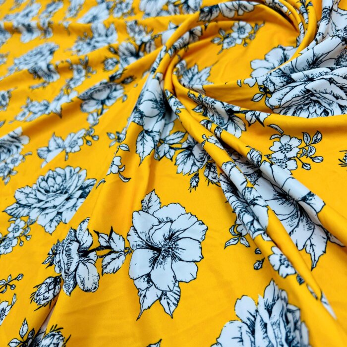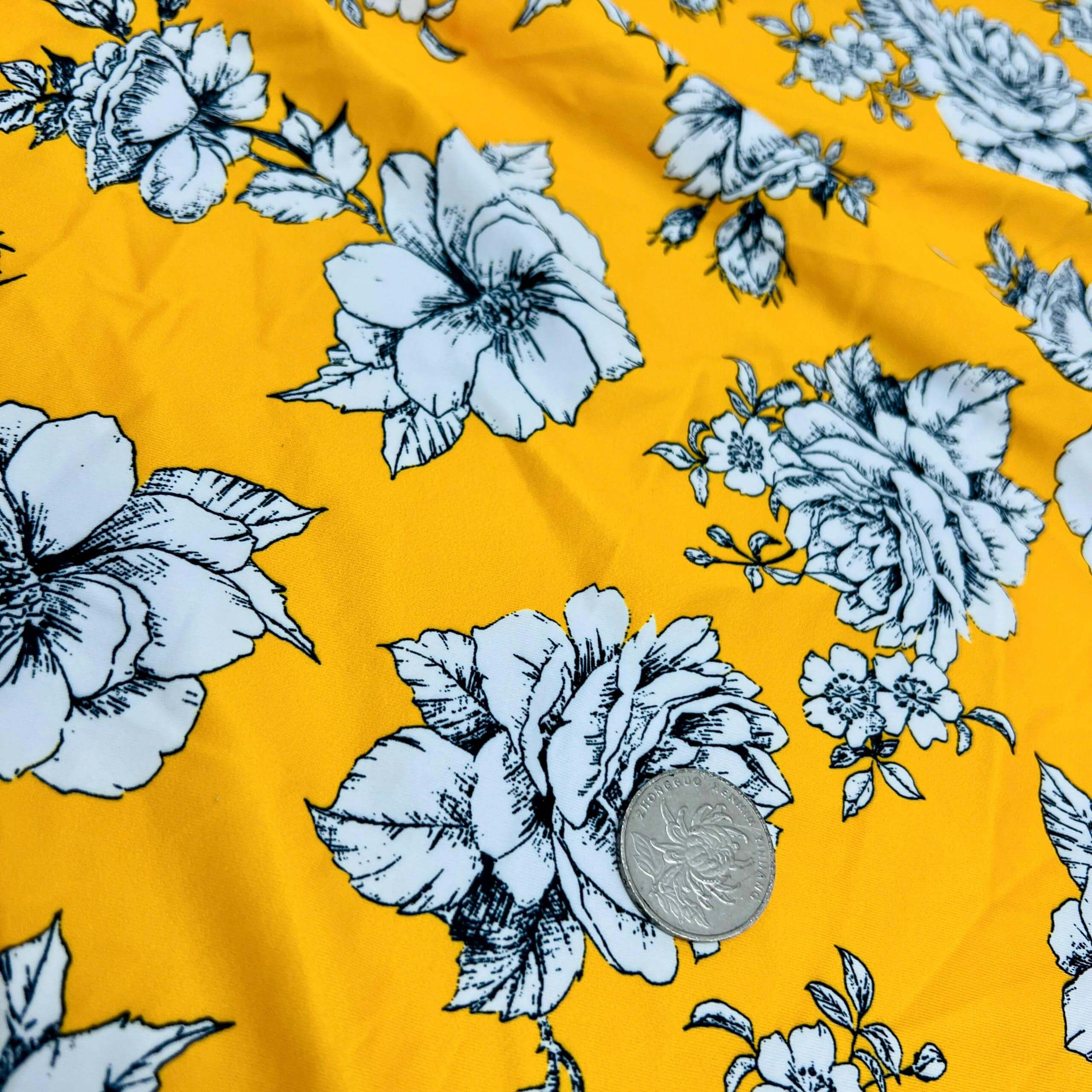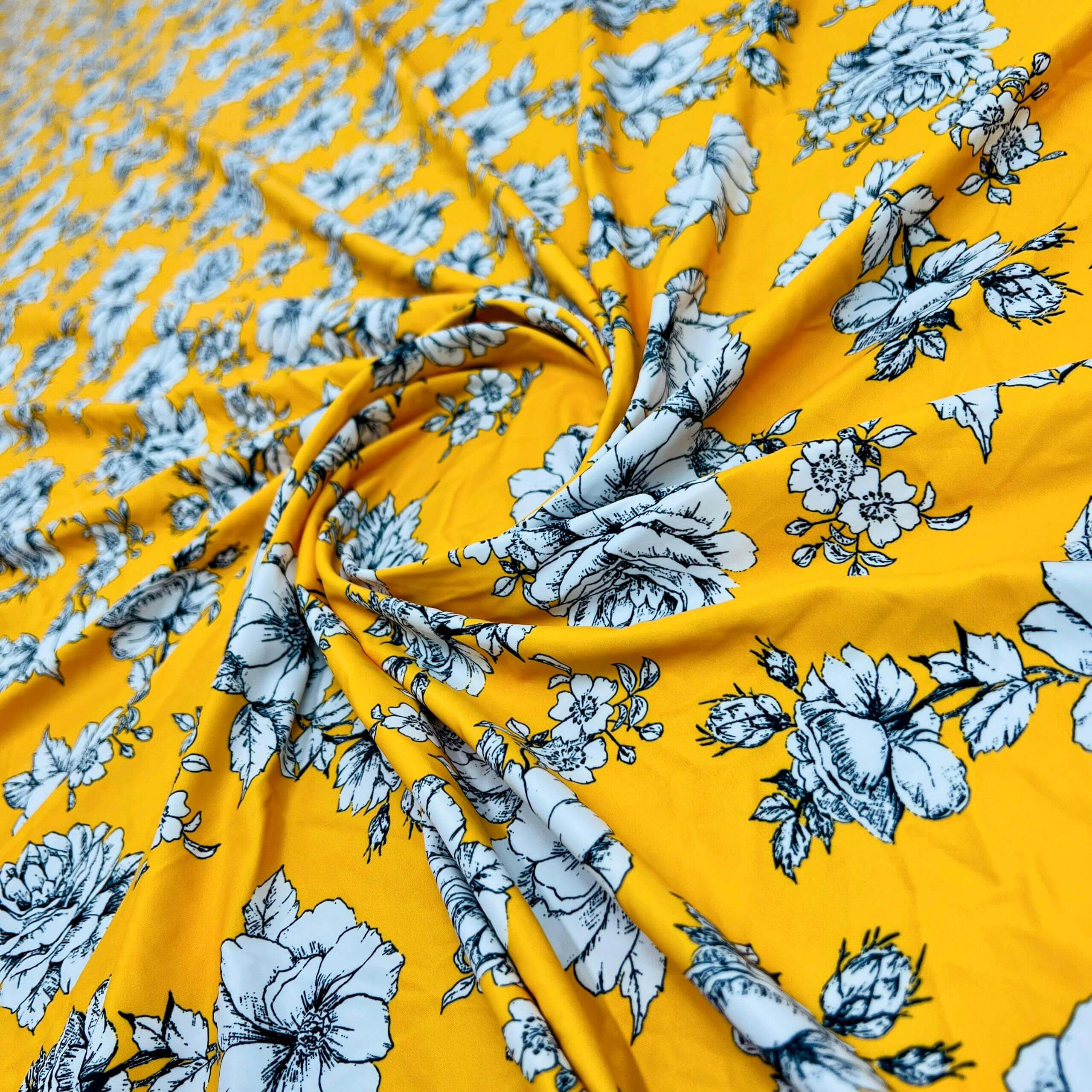 Black and White Flowers Yellow Background Print Nylon Lycra Spandex Fabric 4 Way Stretch By Yard for swimwear dancewear gymwear sportwear dress (239-6)