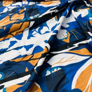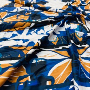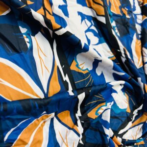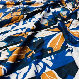 Blue and Orange Leaves Print Nylon Spandex Fabric 4 Way Stretch for swimwear dancewear gymwear sportwear dress skirt (204-5)