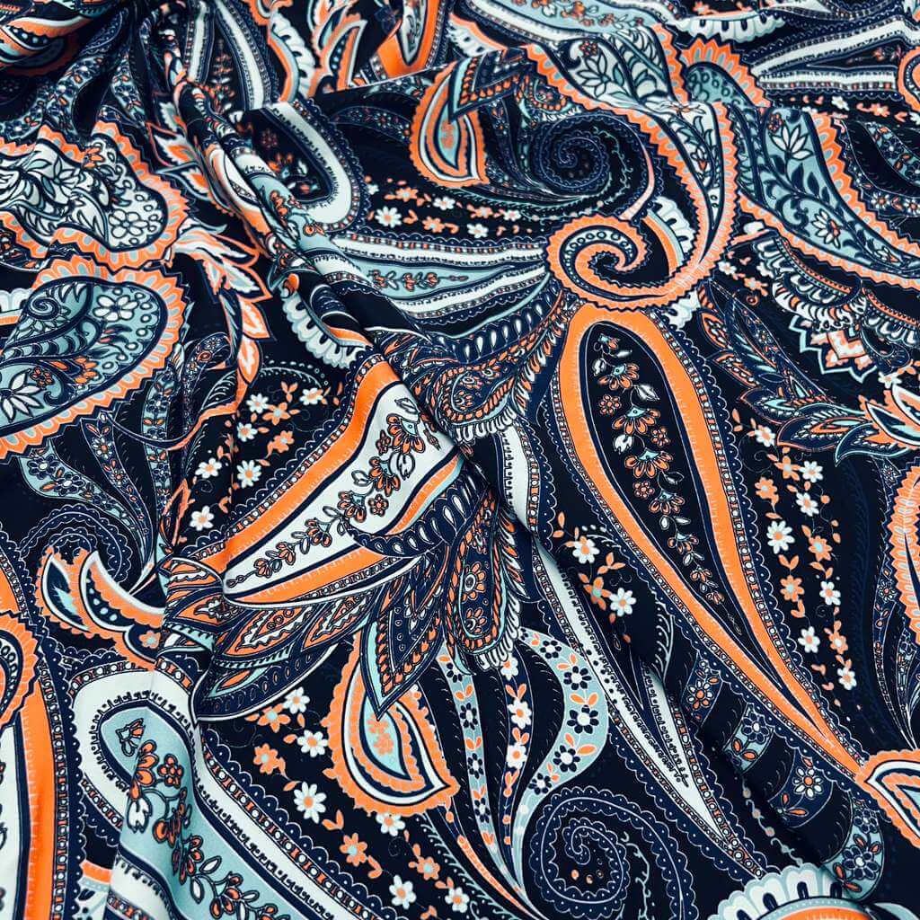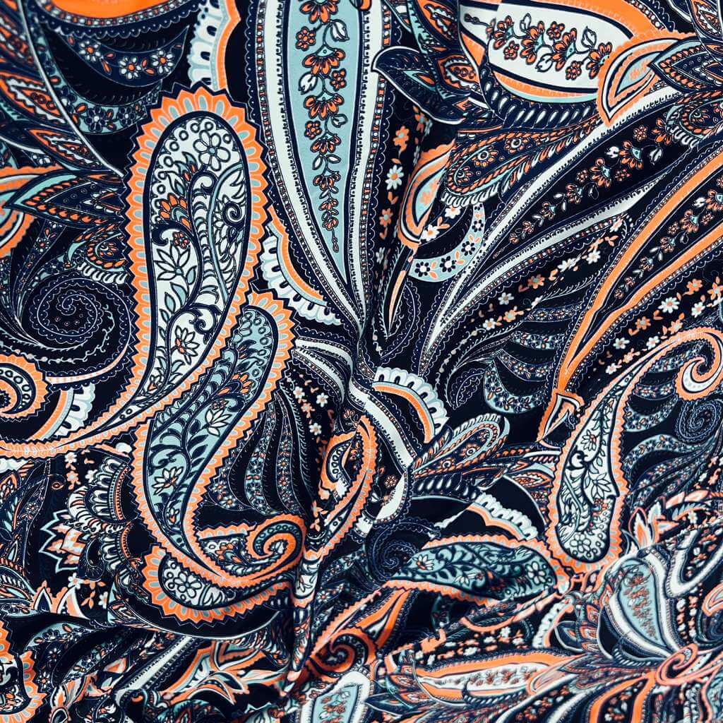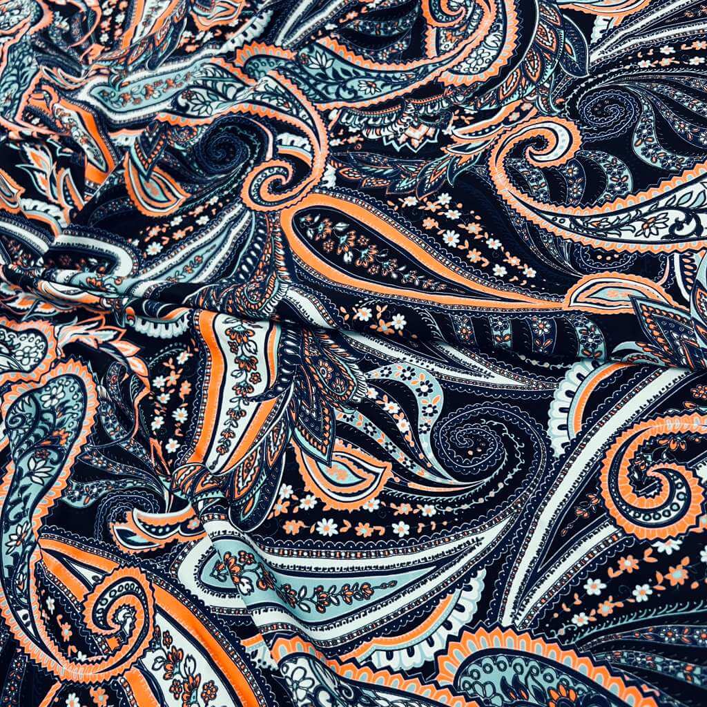 Blue and Orange Paisley Print Nylon Spandex Fabric 4 Way Stretch for swimwear dancewear gymwear sportwear dress skirt (204-4)(21)