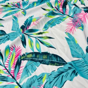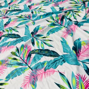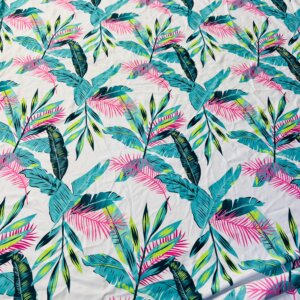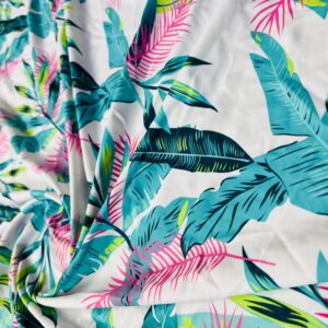Blue and Pink Leaves White Background Print Nylon Spandex Fabric 4 Way Stretch By Yard for swimwear dancewear gymwear sportwear (203-6)