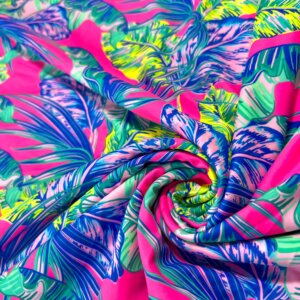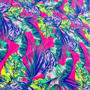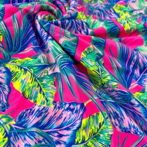 Blue Leaves Hot Pink background Print Nylon Lycra Spandex Fabric 4 Way Stretch By Yard for swimwear dancewear gymwear sportwear dress