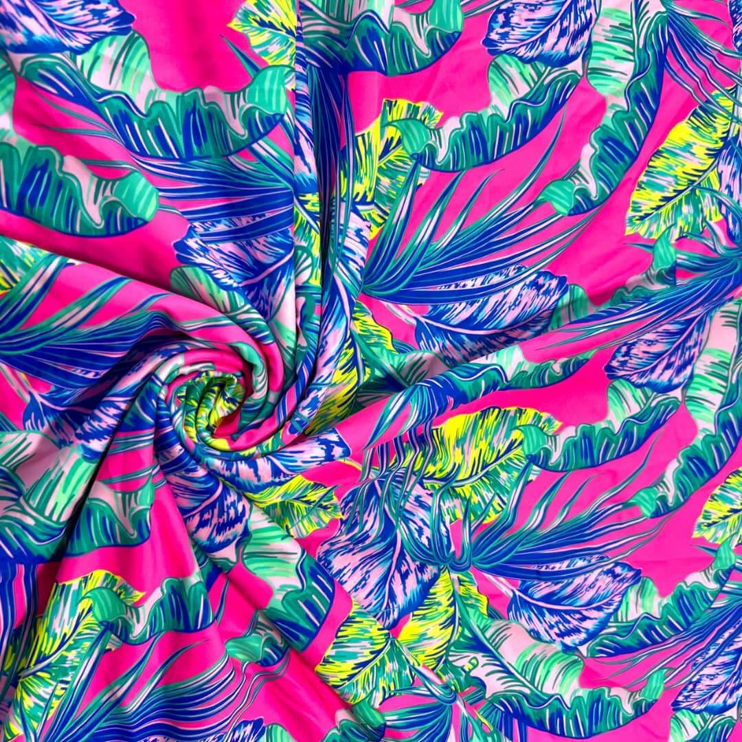Blue Leaves Hot Pink background Print Nylon Lycra Spandex Fabric 4 Way Stretch By Yard for swimwear dancewear gymwear sportwear dress
