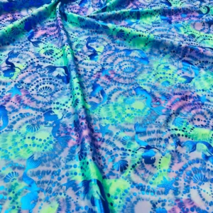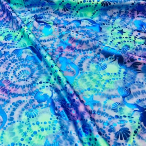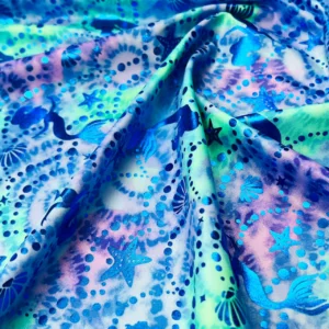27″ Long / Blue Metallic Mermaids and Starfish Print Nylon Spandex Fabric 4 Way Stretch By Yard for swimwear dancewear gymwear sportwear dress skirt (239-12)