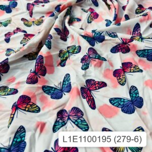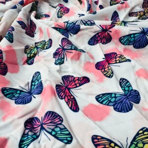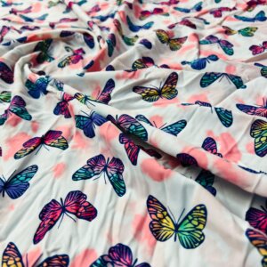 You are visualizing Butterflies Pink and White background Print Nylon Lycra Spandex Fabric 4 Way Stretch By Yard for swimwear dancewear sportwear dress