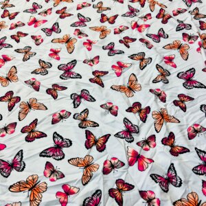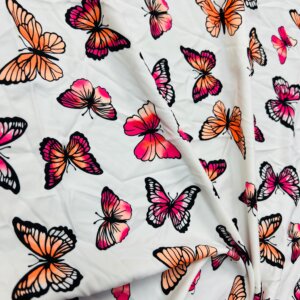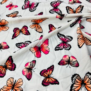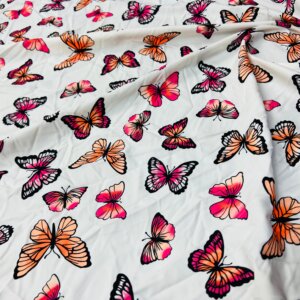You are visualizing Butterflies White background Print Nylon Lycra Spandex Fabric 4 Way Stretch By Yard for swimwear dancewear gymwear sportwear dress