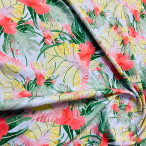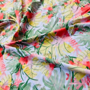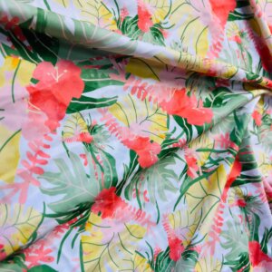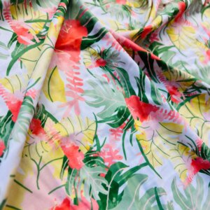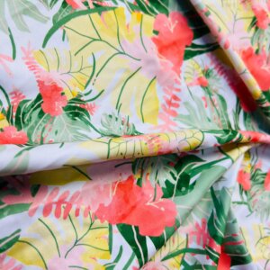 Cayennes and Leaves White Background Print Nylon Lycra Spandex Fabric 4 Way Stretch By Yard for swimwear dancewear gymwear sportwear dress