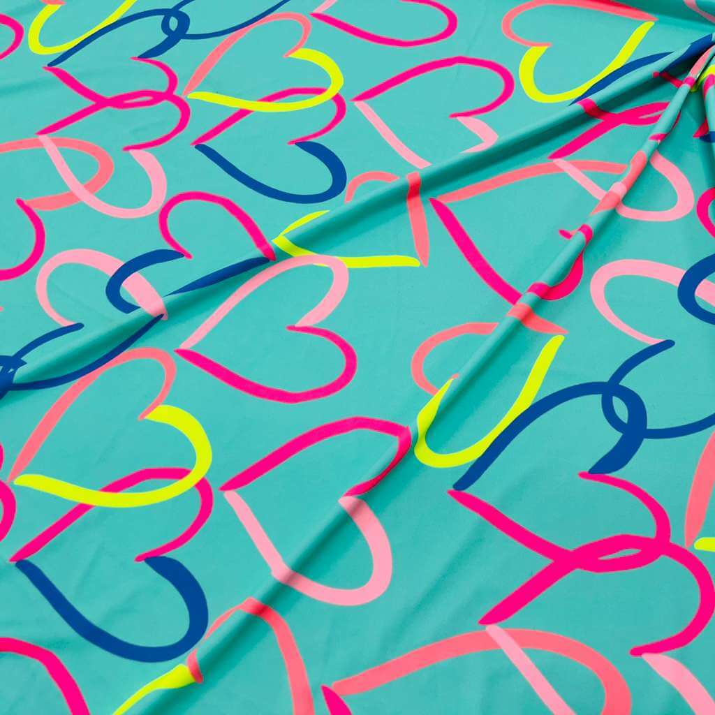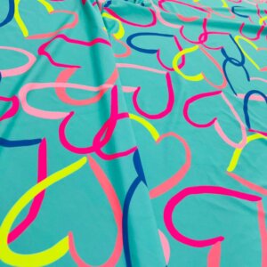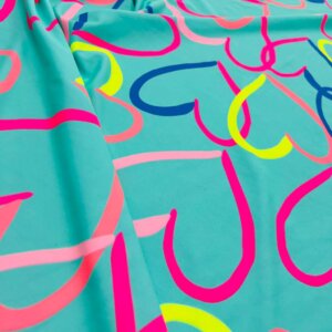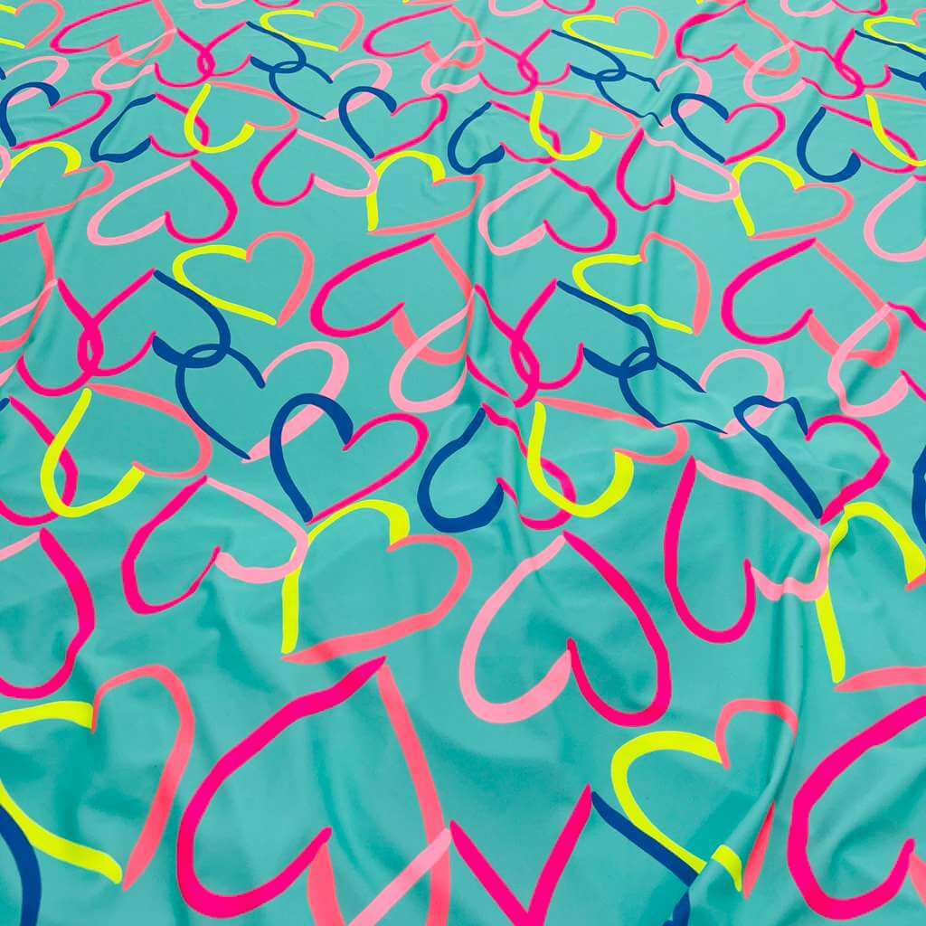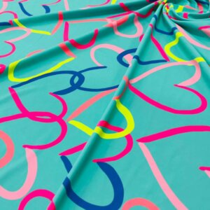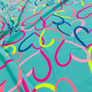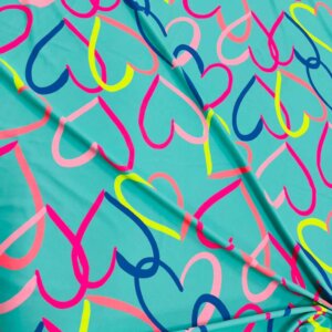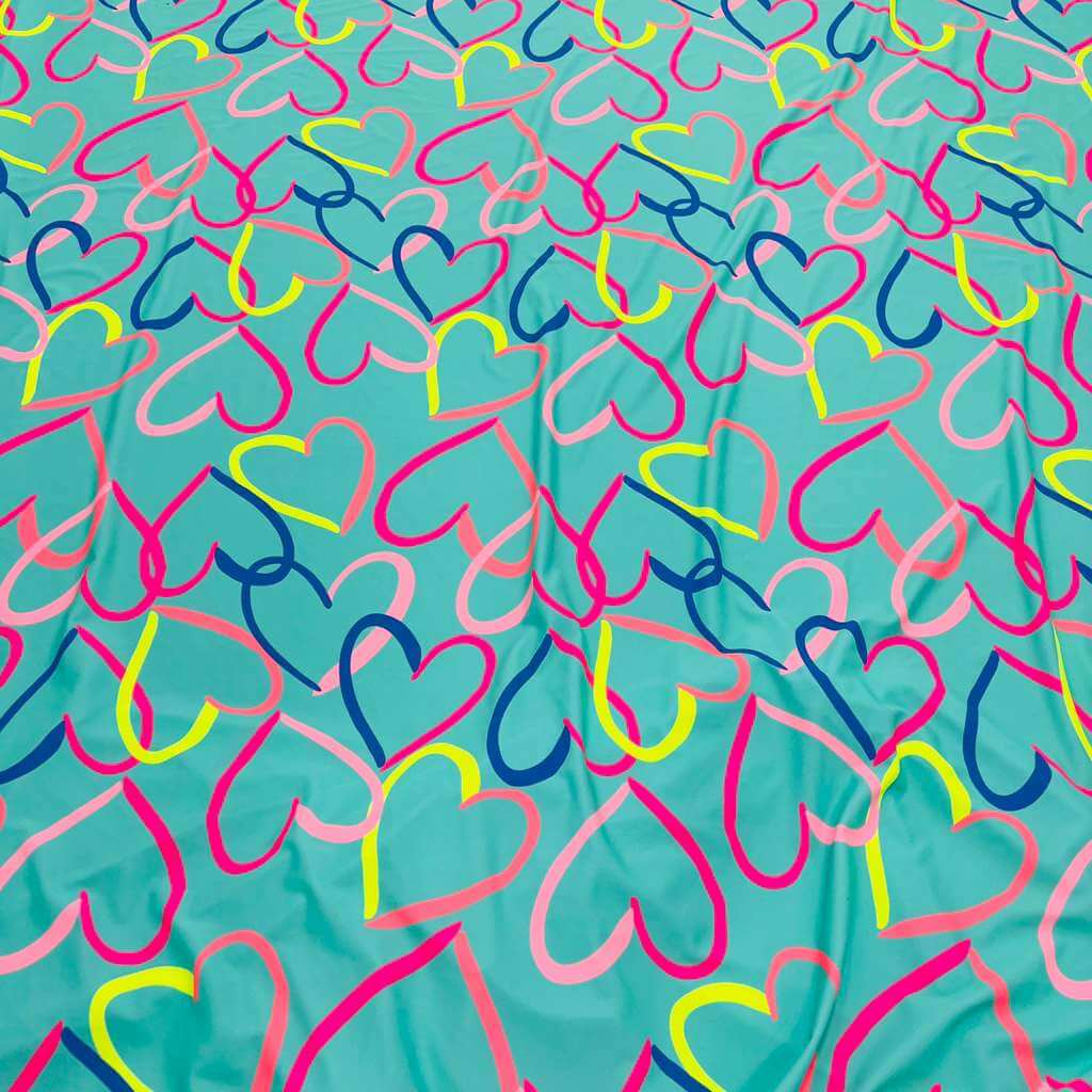 Colored Hearts with Baby Blue Background print Nylon Nylon Lycra Spandex Fabric 4 Way Stretch By Yard for swimwear dancewear gymwear sportwear dress (115-2)(28)