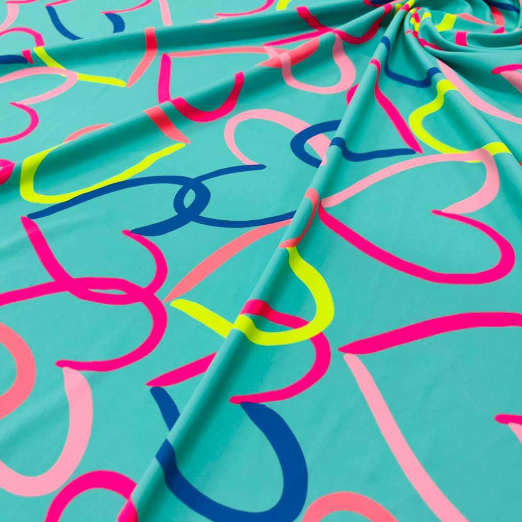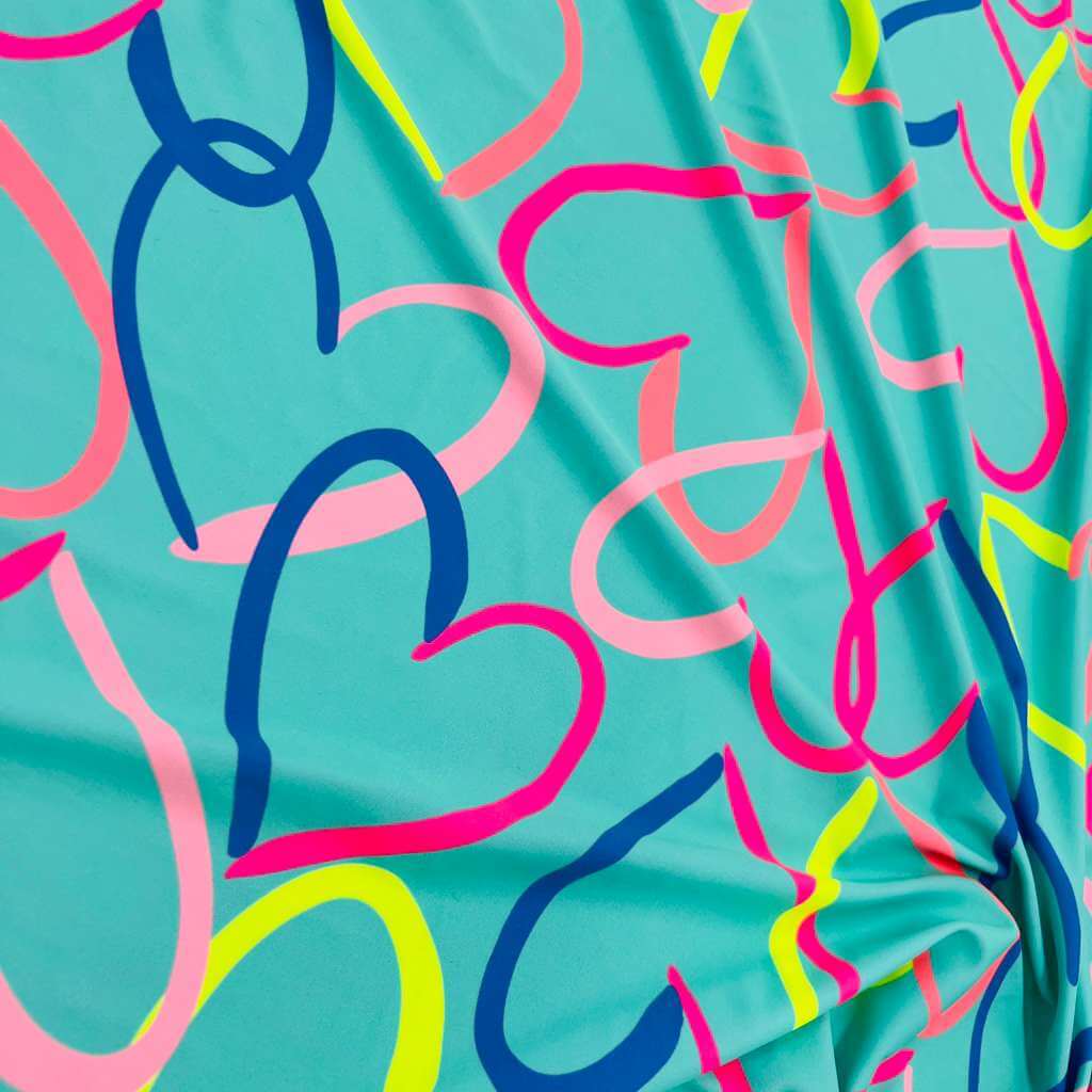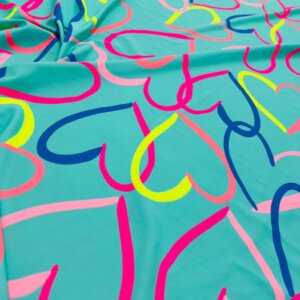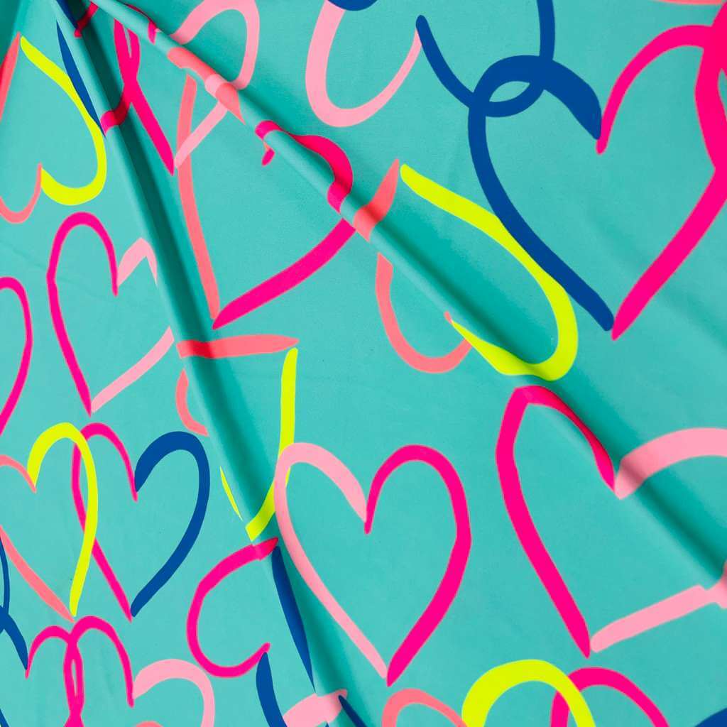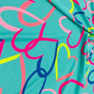 Colored Hearts with Baby Blue Background print Nylon Nylon Lycra Spandex Fabric 4 Way Stretch By Yard for swimwear dancewear gymwear sportwear dress (115-2)(28)