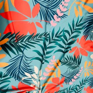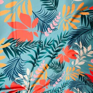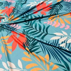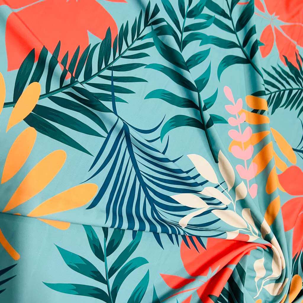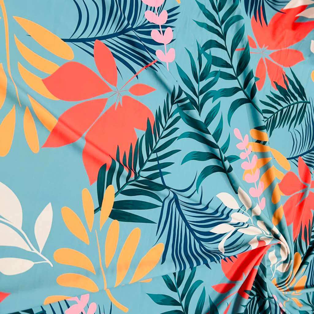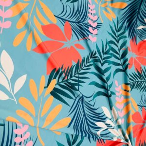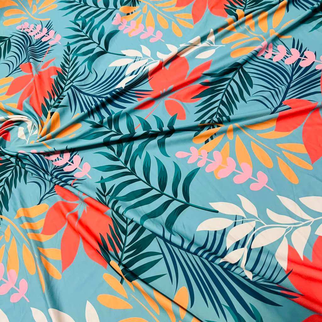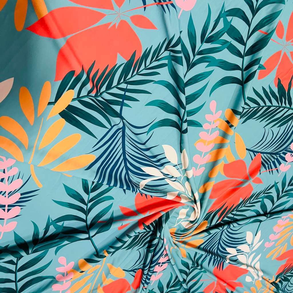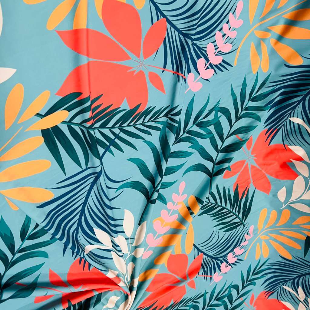 Colored Leaves with Pastel Blue print Nylon Lycra Spandex Fabric 4 Way Strech by Yard for swimwear dancewear dress gymwear (159-2)(18)