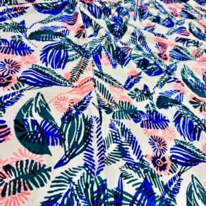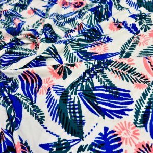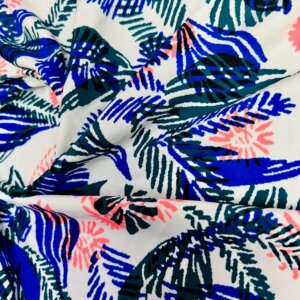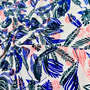 Coral and Blue Leaves White background Print Nylon Lycra Spandex Fabric 4 Way Stretch By Yard for swimwear dancewear gymwear sportwear dress (239-5)