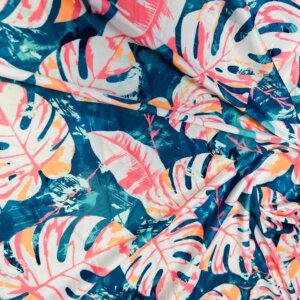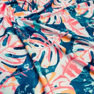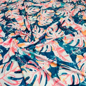 Coral and Orange Leaves Blue background Print Nylon Lycra Spandex Fabric 4 Way Stretch By Yard for swimwear dancewear gymwear sportwear dress (239-5)