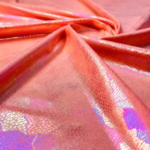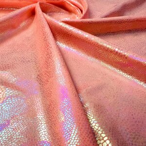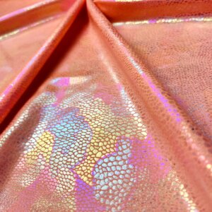 You are viewing Coral Pearl Hologram Metallic Foil With Nylon Lycra Spandex Fabric 4 Way Stretch for swimwear dancewear sportwear dress