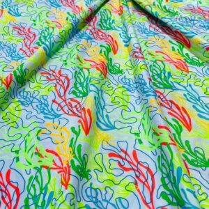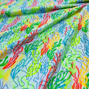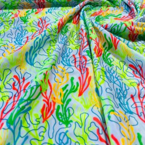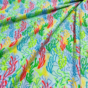 Corals Green Blue and Orange Neon White background Print Nylon Lycra Spandex Fabric 4 Way Stretch By Yard for swimwear dancewear gymwear sportwear dress (203-9)