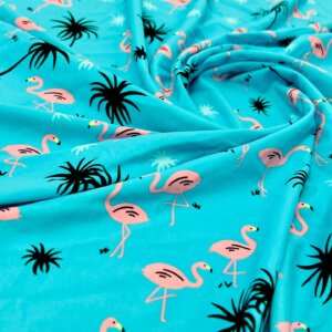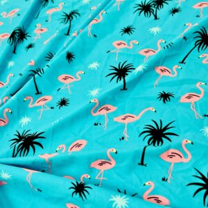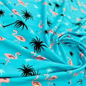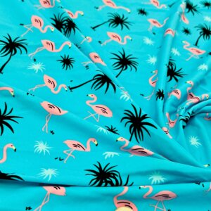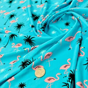 Flamingos and Palm Trees Blue Background Print Nylon Lycra Spandex Fabric 4 Way Stretch By Yard for swimwear dancewear gymwear sportwear dress (239-7)