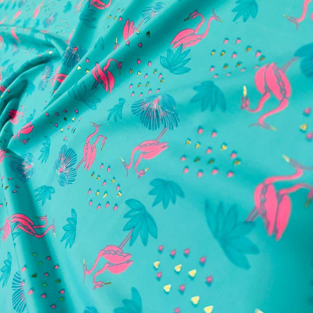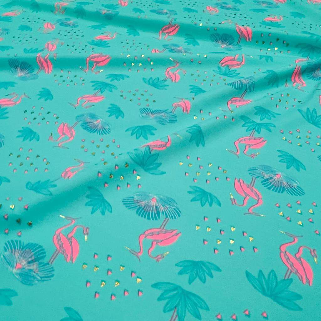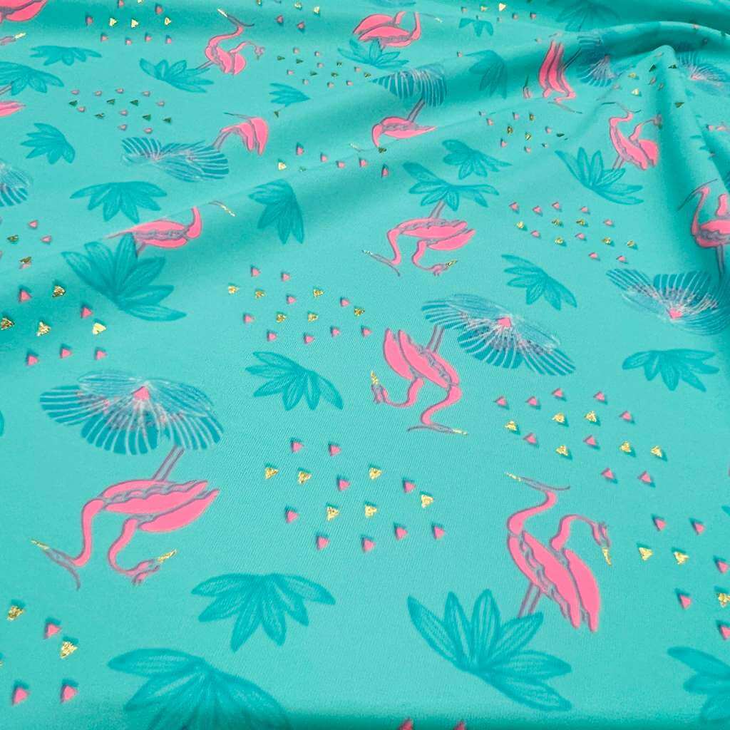 Baby Blue Background Hot Pink and Gold Miami Flamingo print Nylon Nylon Lycra Spandex Fabric 4 Way Stretch By Yard for swimwear dancewear gymwear sportwear dress (159-7)(15)
