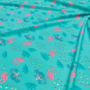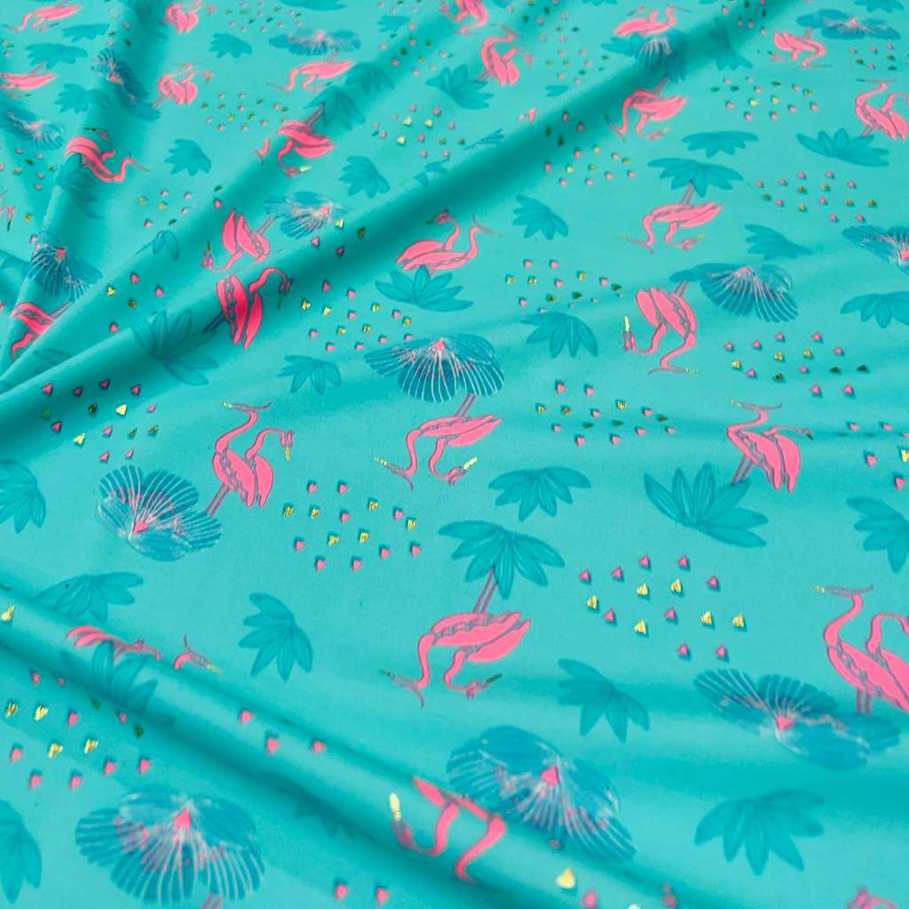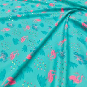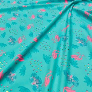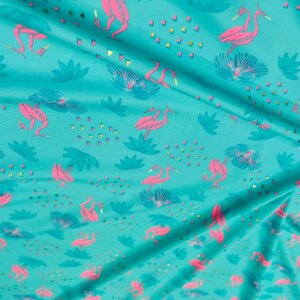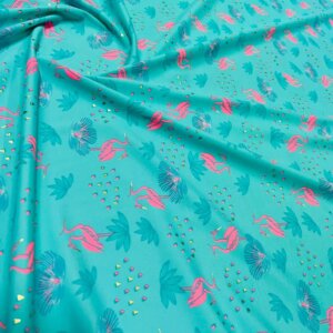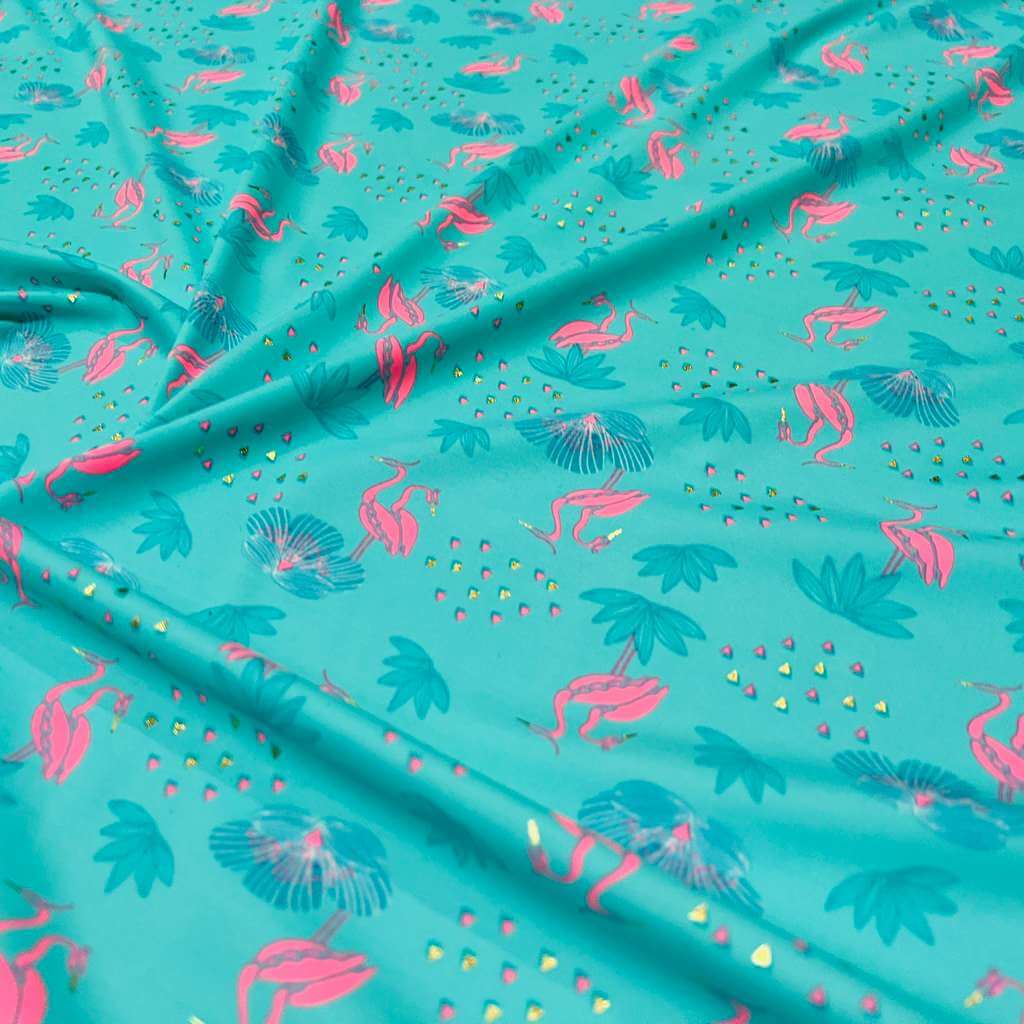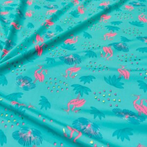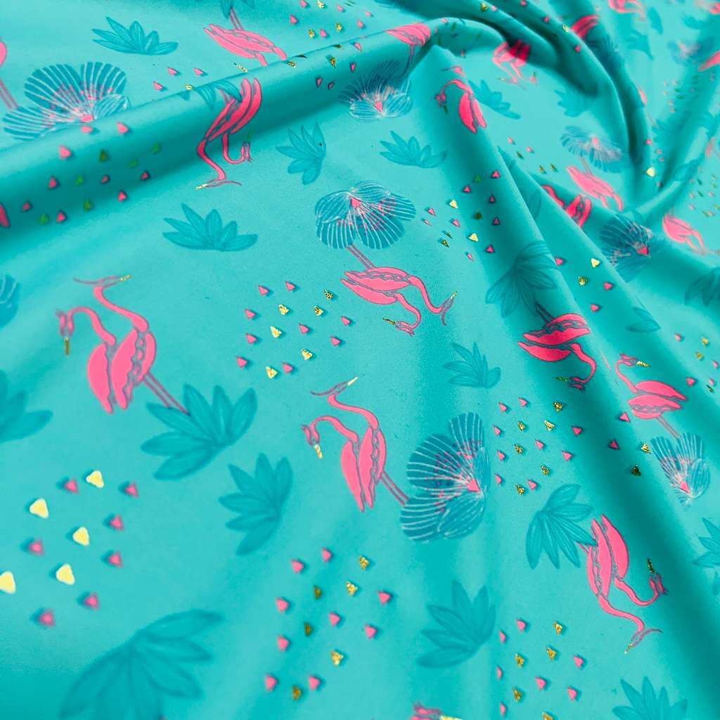 Baby Blue Background Hot Pink and Gold Miami Flamingo print Nylon Nylon Lycra Spandex Fabric 4 Way Stretch By Yard for swimwear dancewear gymwear sportwear dress (159-7)(15)