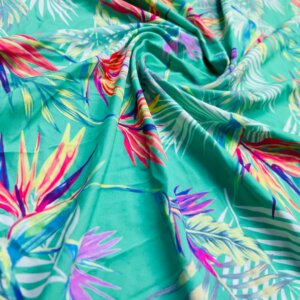 18″ Long / Flowers Birds of Paradise Aquamarine background Print Nylon Lycra Spandex Fabric 4 Way Stretch By Yard for swimwear dancewear gymwear sportwear dress (203-10)