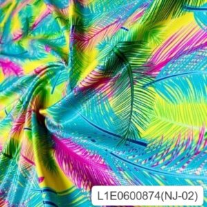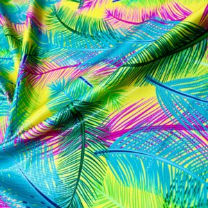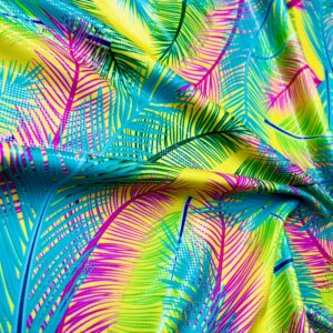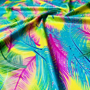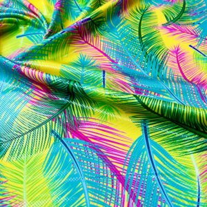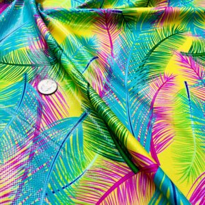 Fuchsia and Blue Leaves Neon Yellow background Print Nylon Lycra Spandex Fabric 4 Way Stretch By Yard for swimwear dancewear gymwear sportwear
