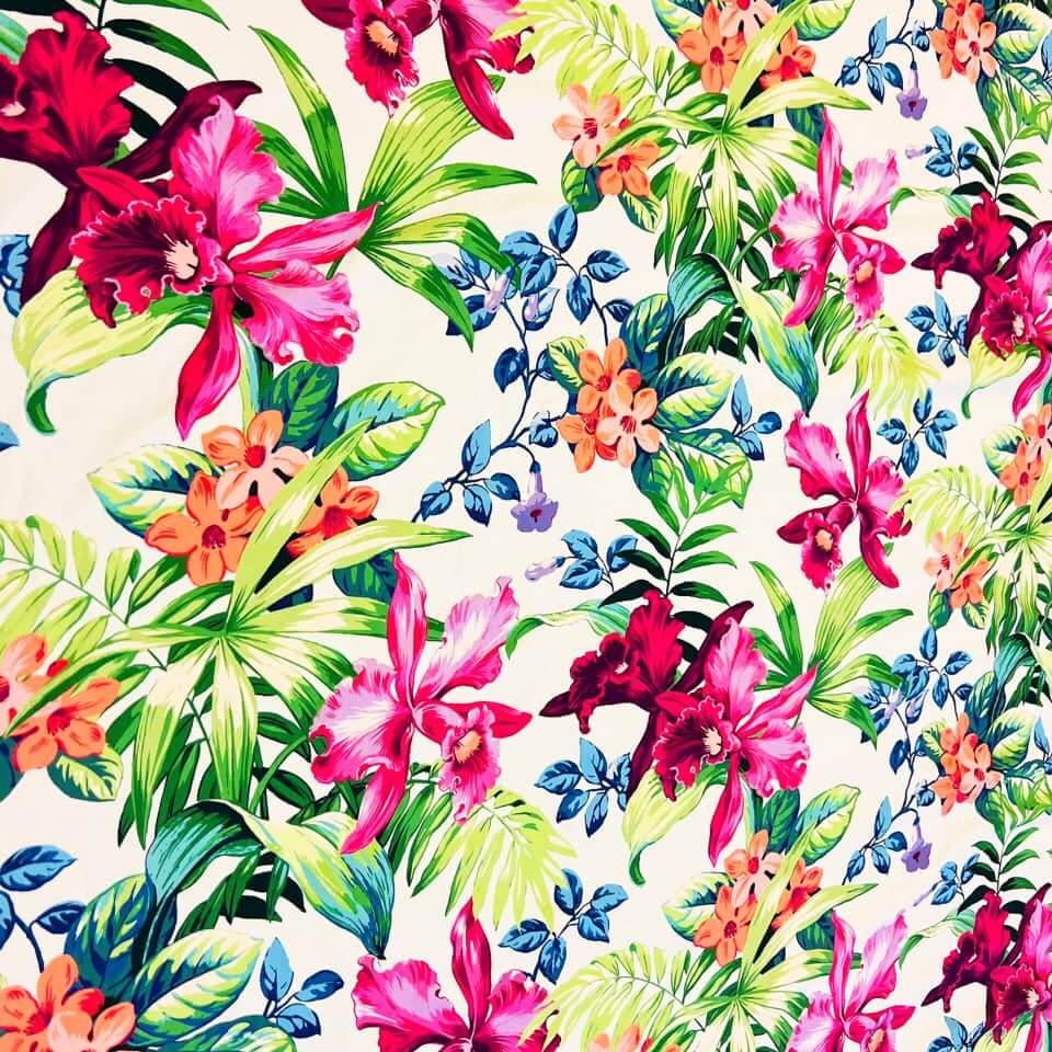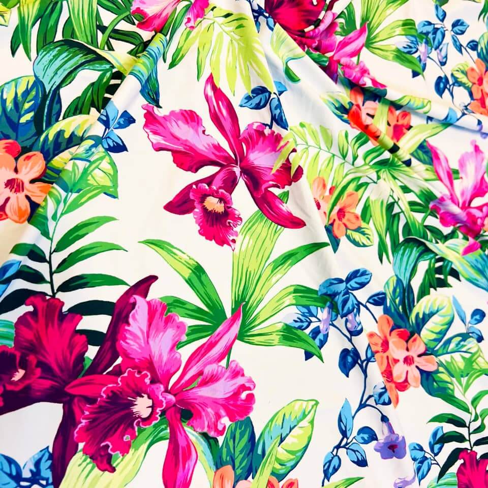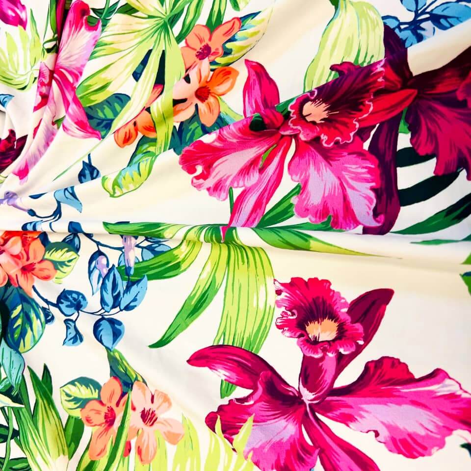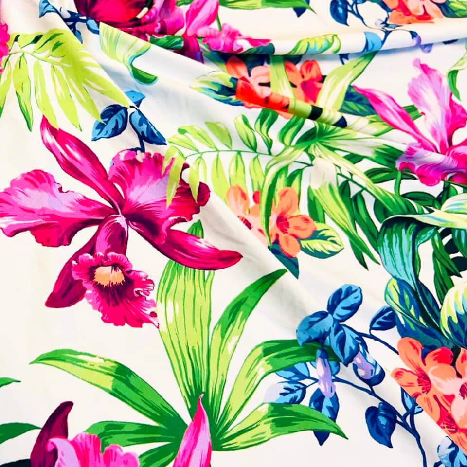 Hawaiian Tropical Flowers Print Nylon Spandex Fabric 4 Way Stretch By Yard for swimwear dancewear gymwear sportwear dress skirt (239-11)