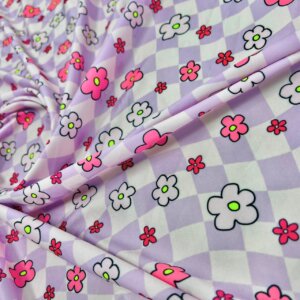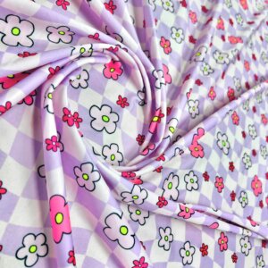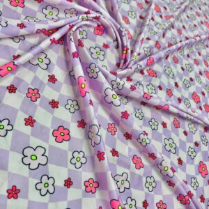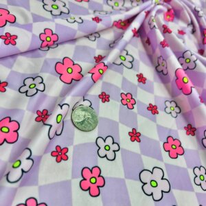 2.5 Yard Long / Little Pink and White Flowers with Purple and White Squares Print Nylon Lycra Spandex Fabric 4 Way Stretch By Yard for swimwear dancewear gymwear sportwear dress (242-12)