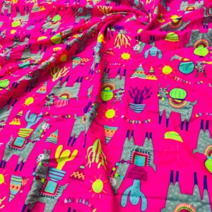 Llamas and Cactus Fuchsia background Print Nylon Lycra Spandex Fabric 4 Way Stretch By Yard for swimwear dancewear gymwear sportwear dress (279-1)