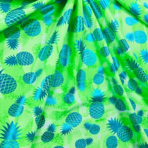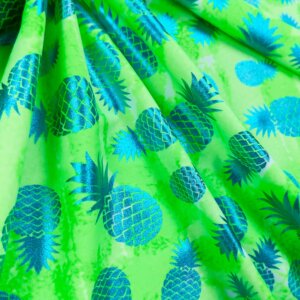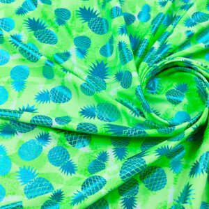 Metallic Blue Pineapples Neon Green background Print Nylon Lycra Spandex Fabric 4 Way Stretch for Swimwear Dancewear Sportwear (204-12)