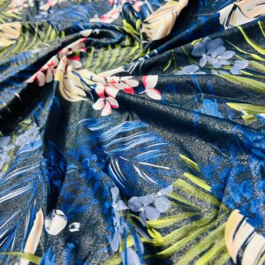 Metallic Flowers and Blue Leaves Print Nylon Lycra Spandex Fabric 4 Way Stretch By Yard for swimwear dancewear gymwear sportwear dress (203-10)