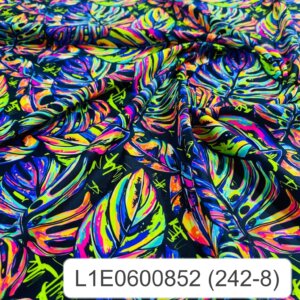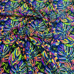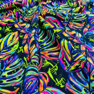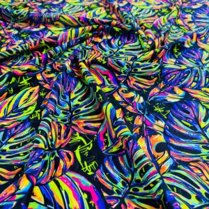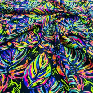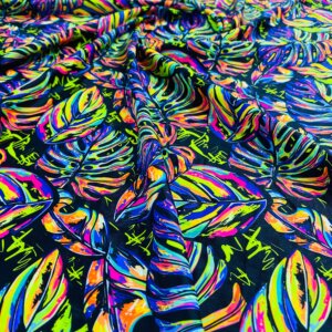 Multicolor Neon Leaves Black Background Print Nylon Lycra Spandex Fabric 4 Way Stretch By Yard for swimwear dancewear gymwear sportwear dress
