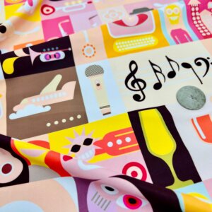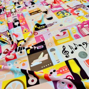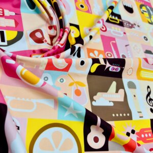 Musical Instruments and Characters Print Nylon Lycra Spandex Fabric 4 Way Stretch By Yard for swimwear dancewear gymwear sportwear dress (203-7)