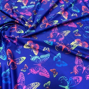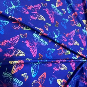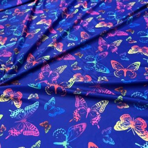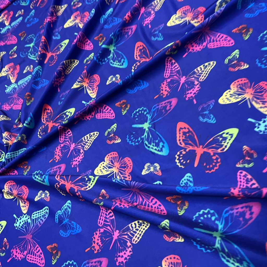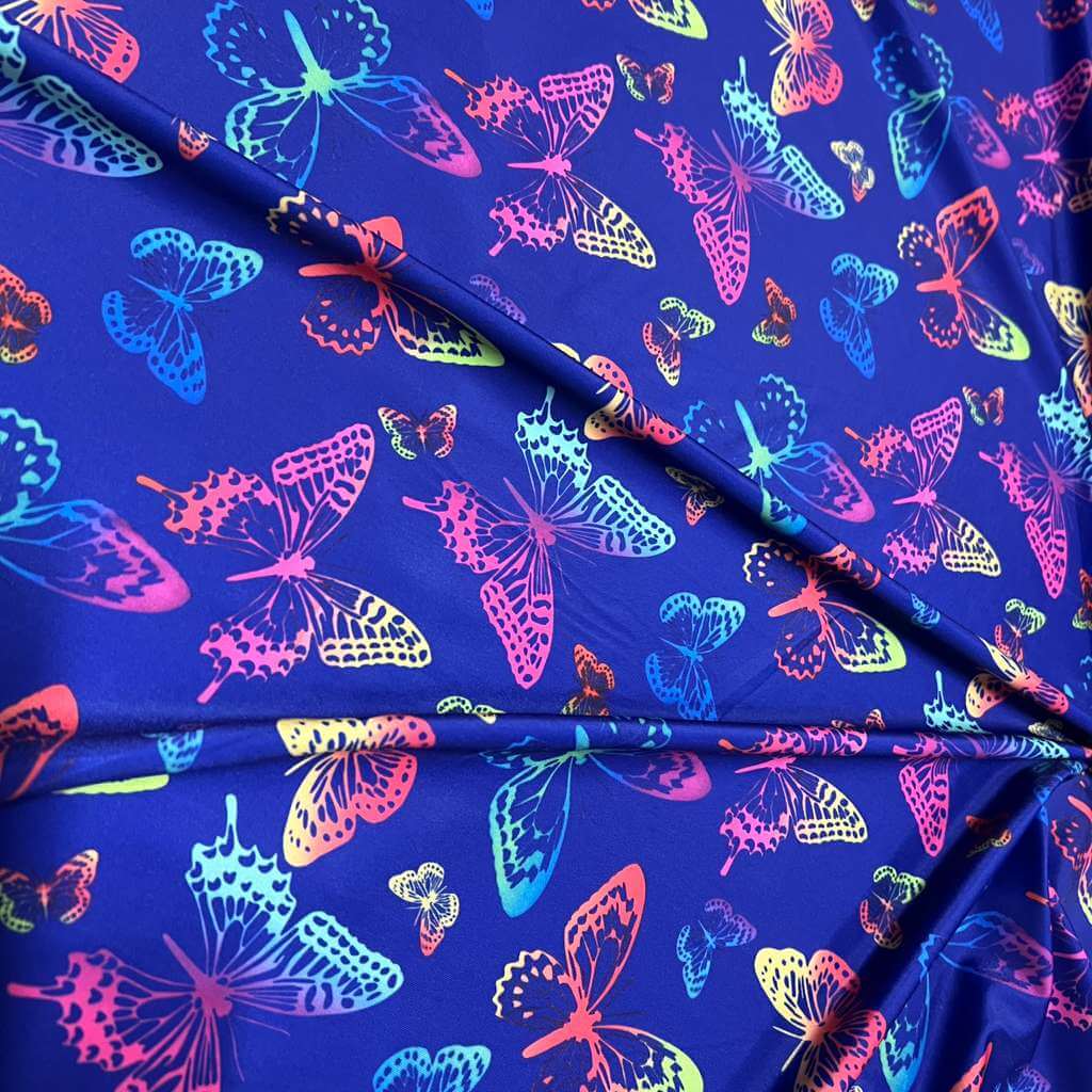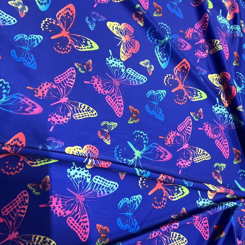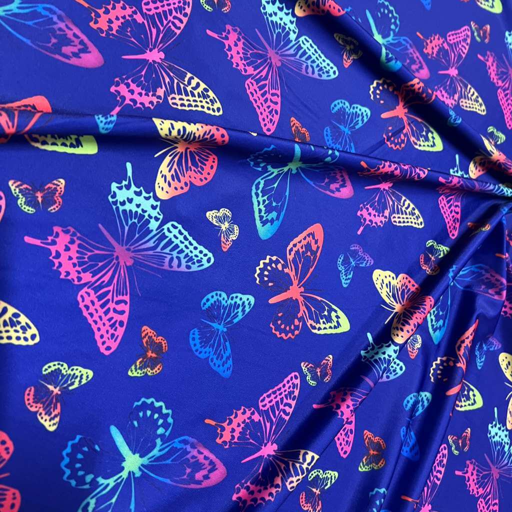 Neon Multicolor Butterflies with Blue Background print Nylon Nylon Lycra Spandex Fabric 4 Way Stretch By Yard for swimwear dancewear gymwear sportwear dress (159-2)(18)