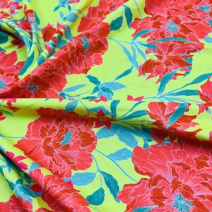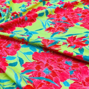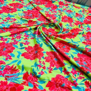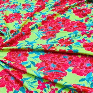 New Design Red Flowers and Green Leaves print Nylon lycra Spandex Fabric 4 Way Stretch for swimwear dancewear gymwear sportwear dress skirt (157-1)