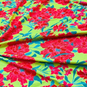 New Design Red Flowers and Green Leaves print Nylon lycra Spandex Fabric 4 Way Stretch for swimwear dancewear gymwear sportwear dress skirt (157-1)