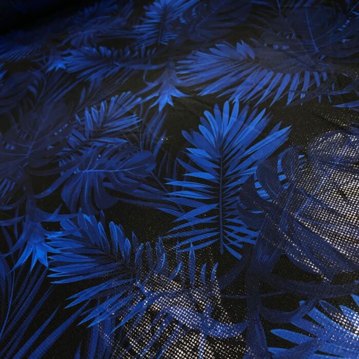 No-Stretch Blue Leaves Hologram Foil Print Polyester Spandex Fabric By Yard for Dress (205-8)