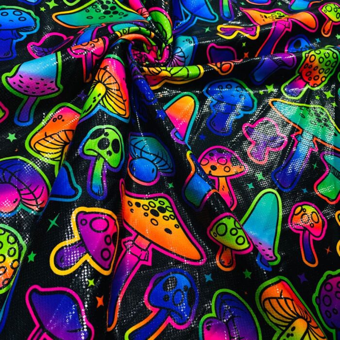 No-Stretch Psychedelic Mushrooms Neon Hologram Foil Print Polyester Spandex Fabric By Yard for Dress (205-8)