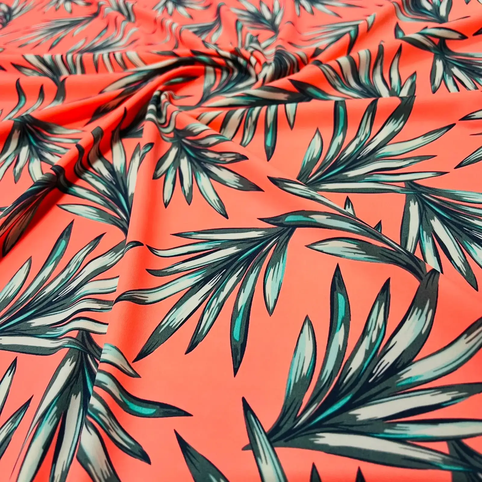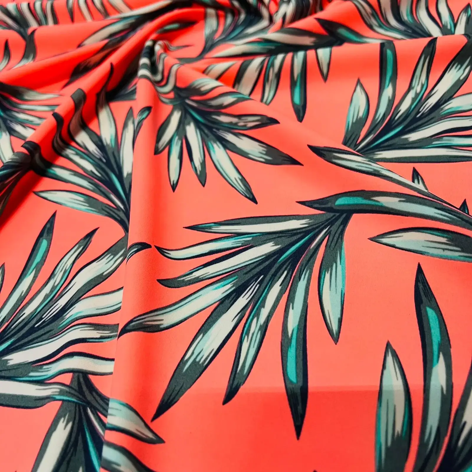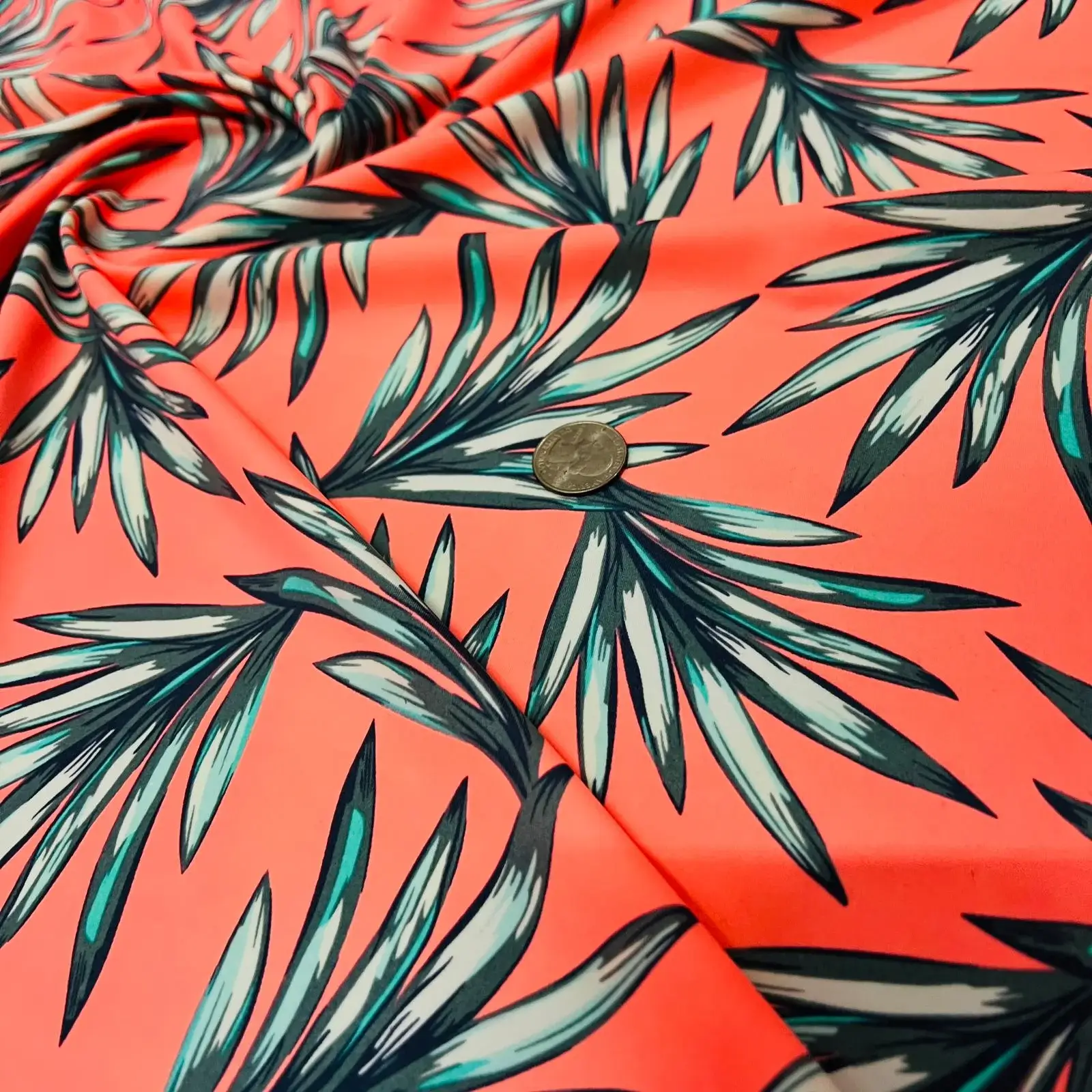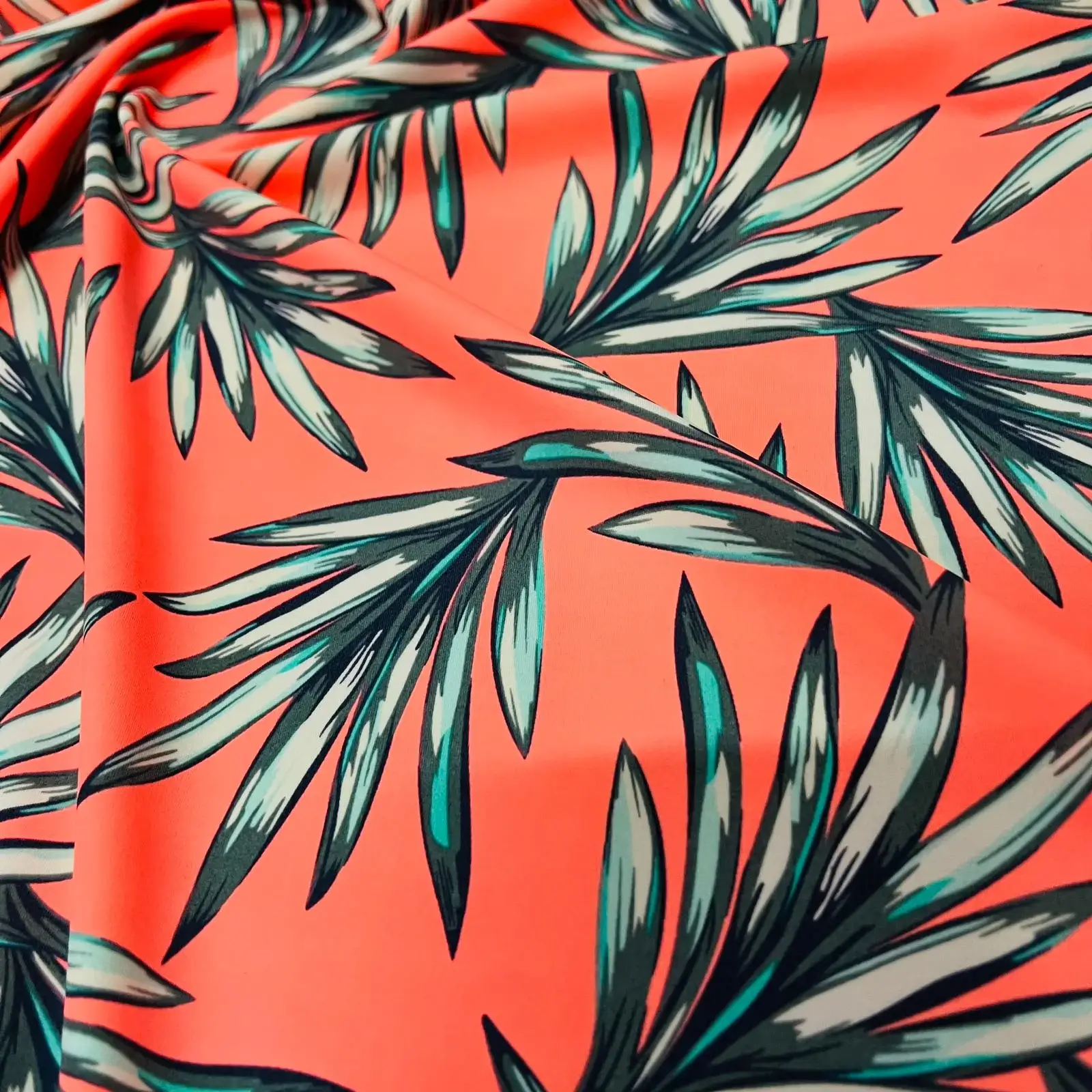 Gray Leaves Coral background Print Nylon Lycra Spandex Fabric 4 Way Stretch for swimwear dancewear gymwear sportwear dress skirt (205-4)