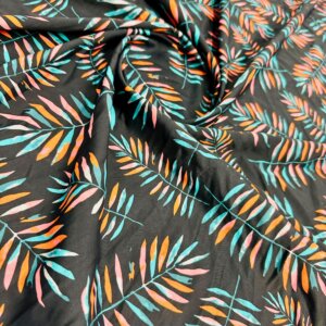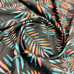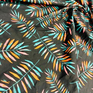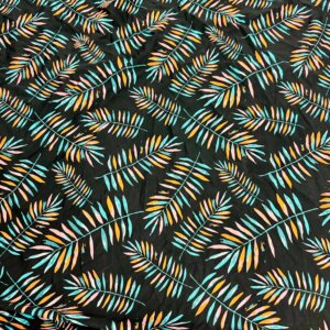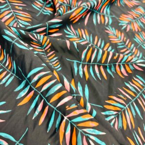 Orange and Blue Leaves Black Background Print Nylon Lycra Spandex Fabric 4 Way Stretch By Yard for swimwear dancewear gymwear sportwear dress (279-10)