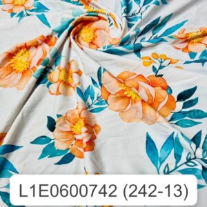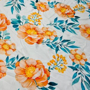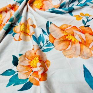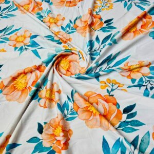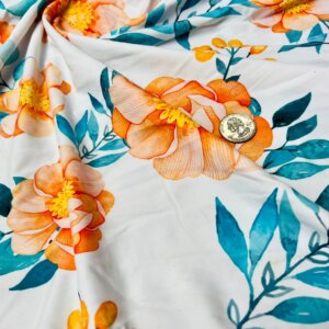 Orange Flowers White Background Print Nylon Lycra Spandex Fabric 4 Way Stretch By Yard for swimwear dancewear gymwear sportwear dress (157-13)
