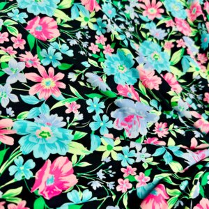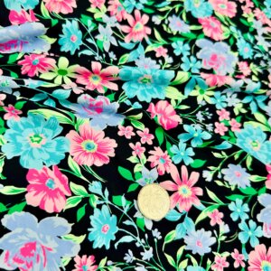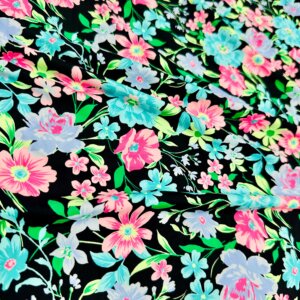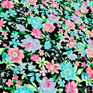 Pink and Blue Flowers Black Background Print Nylon Lycra Spandex Fabric 4 Way Stretch By Yard for swimwear dancewear gymwear sportwear dress (203-7)