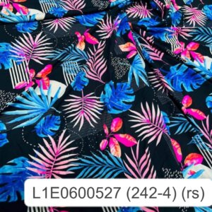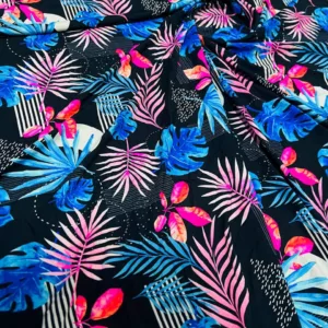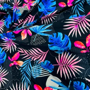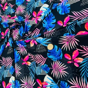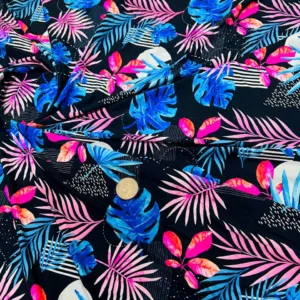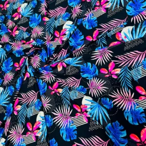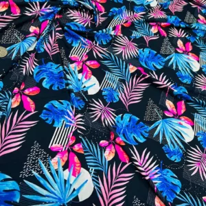 Pink and Blue Leaves Print Nylon Lycra Spandex Fabric 4 Way Stretch by Yard for Swimwear, Dancewear, Sportwear, Dress