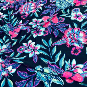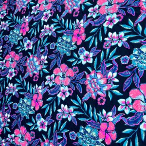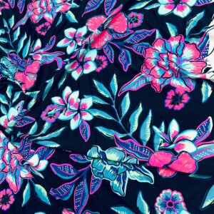 Small Cut (26″ by 36″) Pink and Purple Flowers Navy Blue Background Print Nylon Lycra Spandex Fabric 4 Way Stretch (Small Cut) for swimwear dancewear gymwear sportwear dress (203-10)