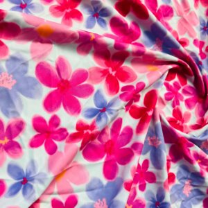 32″ Long Pink and Purple Flowers White Background Print Nylon Lycra Spandex Fabric 4 Way Stretch for swimwear dancewear gymwear sportwear dress (239-5)