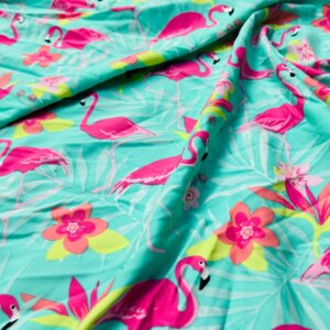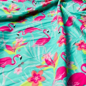 Pink Flamingos and Flowers Aquamarine background Print Nylon Lycra Spandex Fabric 4 Way Stretch By Yard for swimwear dancewear gymwear sportwear dress (239-5)