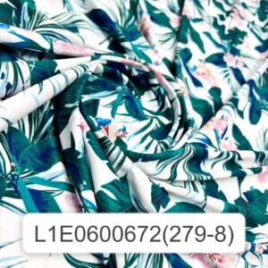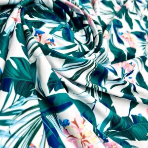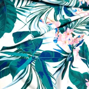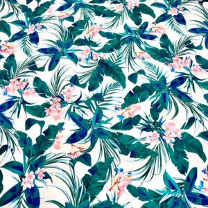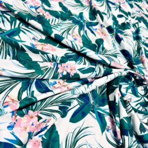 Pink Flowers with Leaves White Background Print Nylon Lycra Spandex Fabric 4 Way Stretch By Yard for swimwear dancewear gymwear sportwear dress (279-8)