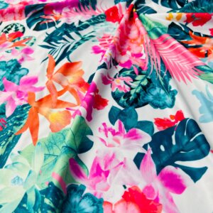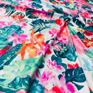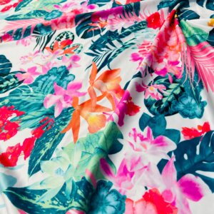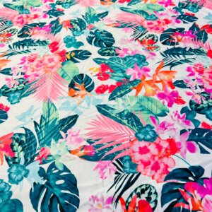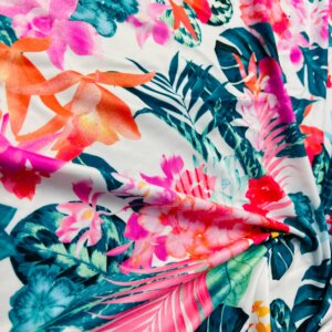 Pink Hawaiian Tropical Flowers White Background Print Nylon Spandex Fabric 4 Way Stretch By Yard for swimwear dancewear gymwear sportwear (203-6)